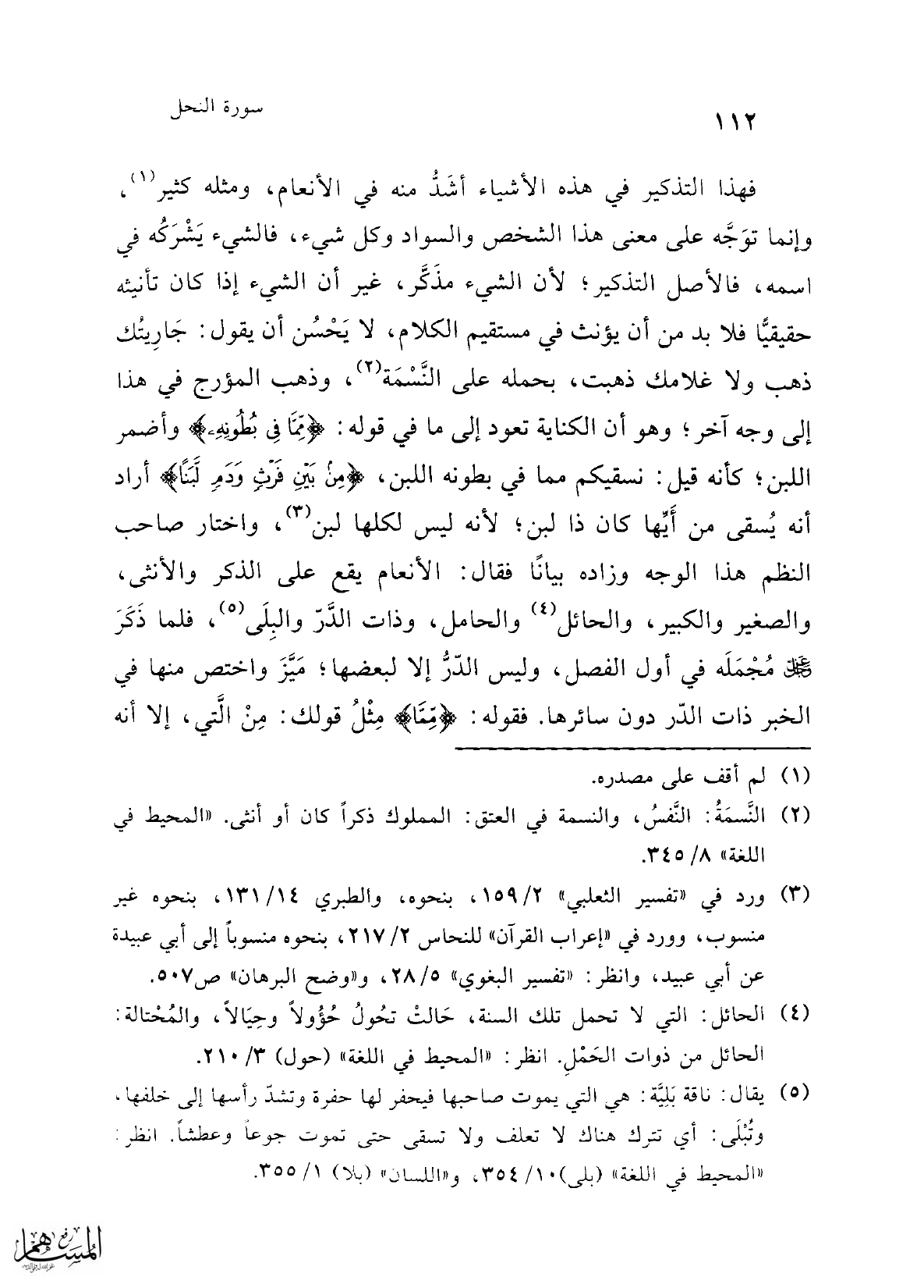 فهذا التذكير في هذه الأشياء أشَدُّ منه في الأنعام، ومثله كثير (¬1)، وإنما توَجَّه على معنى هذا الشخص والسواد وكل شيء، فالشيء يَشْرَكُه في اسمه، فالأصل التذكير؛ لأن الشيء مذَكَّر، غير أن الشيء إذا كان تأنيثه حقيقيًّا فلا بد من أن يؤنث في مستقيم الكلام، لا يَحْسُن أن يقول: جَارِيتُك ذهب ولا غلامك ذهبت، بحمله على النَّسْمَة (¬2)، وذهب المؤرج في هذا إلى وجه آخر؛ وهو أن الكناية تعود إلى ما في قوله: {مِمَّا فِي بُطُونِهِ} وأضمر اللبن؛ كأنه قيل: نسقيكم مما في بطونه اللبن، {مِنْ بَيْنِ فَرْثٍ وَدَمٍ لَبَنًا} أراد أنه يُسقى من أَيِّها كان ذا لبن؛ لأنه ليس لكلها لبن (¬3)، واختار صاحب النظم هذا الوجه وزاده بيانًا فقال: الأنعام يقع على الذكر والأنثى، والصغير والكبير، والحائل (¬4) والحامل، وذات الدَّرّ والبِلَى (¬5)، فلما ذَكَرَ عز وجل مُجْمَلَه في أول الفصل، وليس الدّرُّ إلا لبعضها؛ مَيَّزَ واختص منها في الخبر ذات الدّر دون سائرها. فقوله: {مِمَّا} مِثْلُ قولك: مِنْ الَّتي، إلا أنه