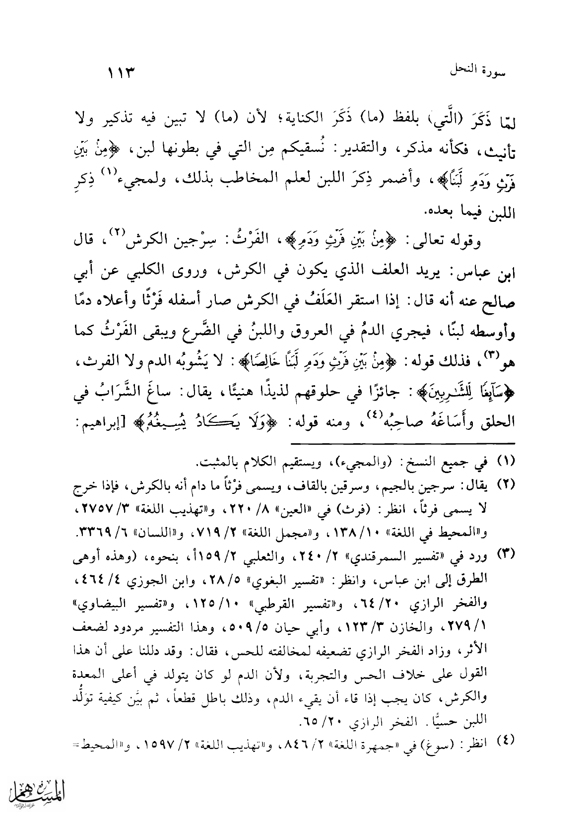 (¬3) ورد في "تفسير السمرقندي" 2/ 240، والثعلبي 2/ 159 أ، بنحوه، (وهذه أوهى الطرق إلى ابن عباس، وانظر: "تفسير البغوي" 5/ 28، وابن الجوزي 4/ 464، والفخر الرازي 20/ 64، و"تفسير القرطبي" 10/ 125، و"تفسير البيضاوي" 1/ 279، والخازن 3/ 123، وأبي حيان 5/ 509، وهذا التفسير مردود لضعف الأثر، وزاد الفخر الرازي تضعيفه لمخالفته للحس، فقال: وقد دللنا على أن هذا القول على خلاف الحس والتجربة، ولأن الدم لو كان يتولد في أعلى المعدة والكرش، كان يجب إذا قاء أن يقيء الدم، وذلك باطل قطعًا، ثم بيَّن كيفية توَلُّد اللبن حسيًّا. الفخر الرازي 20/ 65