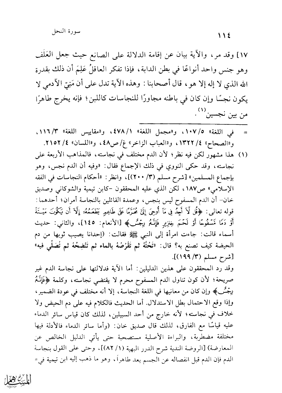 (¬1) هذا مشهور لكن فيه نظر؛ لأن الدم مختلف في نجاسته، فالمذاهب الأربعة على نجاسته، وقد حكى النووي في ذلك الإجماع فقال: "وفيه أن الدم نجس، وهو بإجماع المسلمين" [شرح مسلم (3/ 200)]، وانظر: "أحكام النجاسات في الفقه الإسلامي" ص 187، لكن الذي عليه المحققون -كابن تيمية والشوكاني وصديق خان- أن الدم المسفوح ليس بنجس، وعمدة القائلين بالنجاسة أمران؛ أحدهما: قوله تعالى: {قُلْ لَا أَجِدُ فِي مَا أُوحِيَ إِلَيَّ مُحَرَّمًا عَلَى طَاعِمٍ يَطْعَمُهُ إِلَّا أَنْ يَكُونَ مَيْتَةً أَوْ دَمًا مَسْفُوحًا أَوْ لَحْمَ خِنْزِيرٍ فَإِنَّهُ رِجْسٌ} [الأنعام: 145]، والثاني: حديث أسماء قالت: جاءت امرأة إلى النبي -صلى الله عليه وسلم- فقالت: (إحدانا يصيب ثوبها من دم الحيضة كيف تصنع به؟ قال: "تَحُتُّهُ ثم تَقْرُصُهُ بالماء ثم تَنْضِحُهُ ثم تُصَلَّي فيه" [شرح مسلم (3/ 199)].