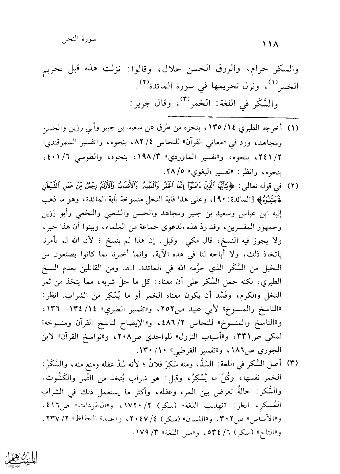 (¬2) في قوله تعالى: {يَا أَيُّهَا الَّذِينَ آمَنُوا إِنَّمَا الْخَمْرُ وَالْمَيْسِرُ وَالْأَنْصَابُ وَالْأَزْلَامُ رِجْسٌ مِنْ عَمَلِ الشَّيْطَانِ فَاجْتَنِبُوهُ} [المائدة: 90]، وعلى هذا فآية النحل منسوخة بآية المائدة، وهو ما ذهب إليه ابن عباس وسعيد بن جبير ومجاهد والحسن والشعبي والنخعي وأبو رَزين وجمهور المفسرين، وقد ردّ هذه الدعوى جماعة من العلماء، وبينوا أن هذا خبر، ولا يجوز فيه النسخ، قال مكي: وقيل: إن هذا لم ينسخ؛ لأن الله لم يأمرنا باتخاذ ذلك، ولا أباحه لنا في هذه الآية، وإنما أخبرنا بما كانوا يصنعون من النخيل من السَّكَر الذي حرَّمه الله في المائدة. ا. هـ. ومن القائلين بعدم النسخ الطبري، لكنه حمل السَّكر على أن معناه: كل ما حلّ شربه، مما يتخذ من ثمر النخل والكرم، وفَسَّد أن يكون معناه الخمر أو ما يُسْكِر من الشراب. انظر: "الناسخ والمنسوخ" لأبي عبيد ص 252، و"تفسير الطبري" 14/ 134 - 136، و"الناسخ والمنسوخ" للنحاس 2/ 486، و"الإيضاح لناسخ القرآن ومنسوخه" لمكي ص 331، و"أسباب النزول" للواحدي ص 208، و"نواسخ القرآن" لابن الجوزي ص 186، و"تفسير القرطبي" 10/ 130.