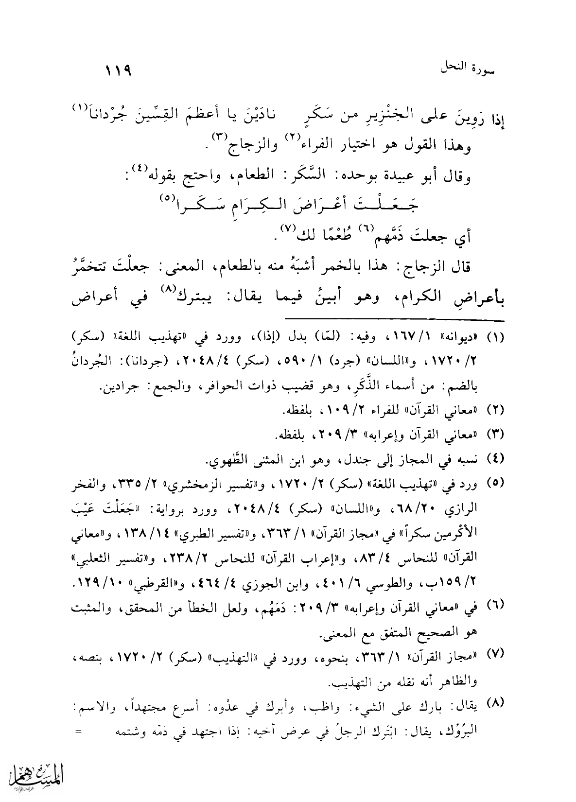 (¬5) ورد في "تهذيب اللغة" (سكر) 2/ 1720، و"تفسير الزمخشري" 2/ 335، والفخر الرازي 20/ 68، و"اللسان" (سكر) 4/ 2048، وورد برواية: "جَعَلْتَ عَيْبَ الأكْرمين سكرًا" في "مجازالقرآن" 1/ 363، و"تفسير الطبري" 14/ 138، و"معاني القرآن" للنحاس 4/ 83، و"إعراب القرآن" للنحاس 2/ 238، و"تفسير الثعلبي" 2/ 159 ب، والطوسي 6/ 401، وابن الجوزي 4/ 464، و"القرطبي" 10/ 129.