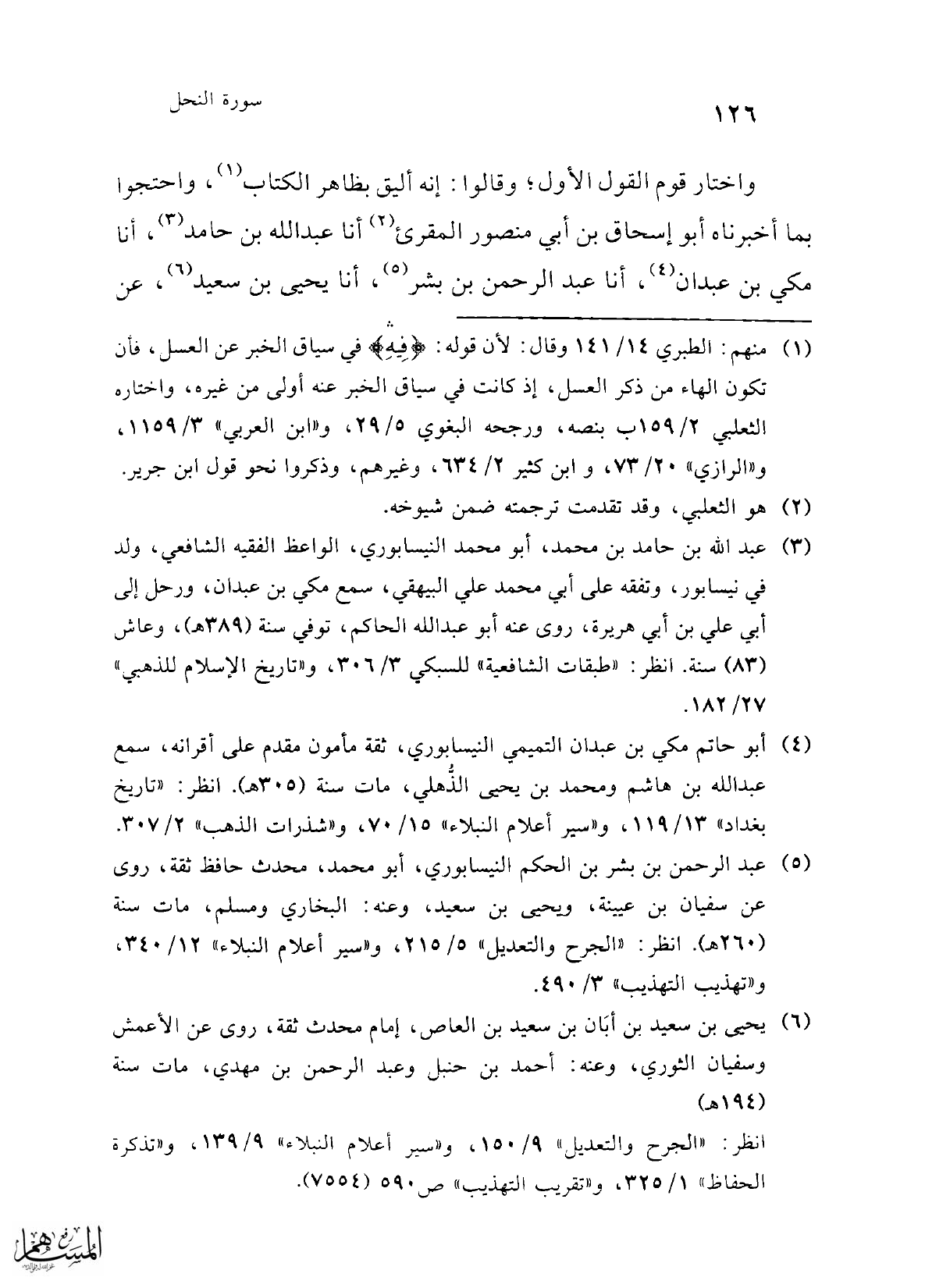 واختار قوم القول الأول؛ وقالوا: إنه أليق بظاهر الكتاب (¬1)، واحتجوا بما أخبرناه أبو إسحاق بن أبي منصور المقرئ (¬2) أنا عبد الله بن حامد (¬3)، أنا مكي بيت عبدان (¬4)، أنا عبد الرحمن بن بشر (¬5)، أنا يحيى بن سعيد (¬6)، عن