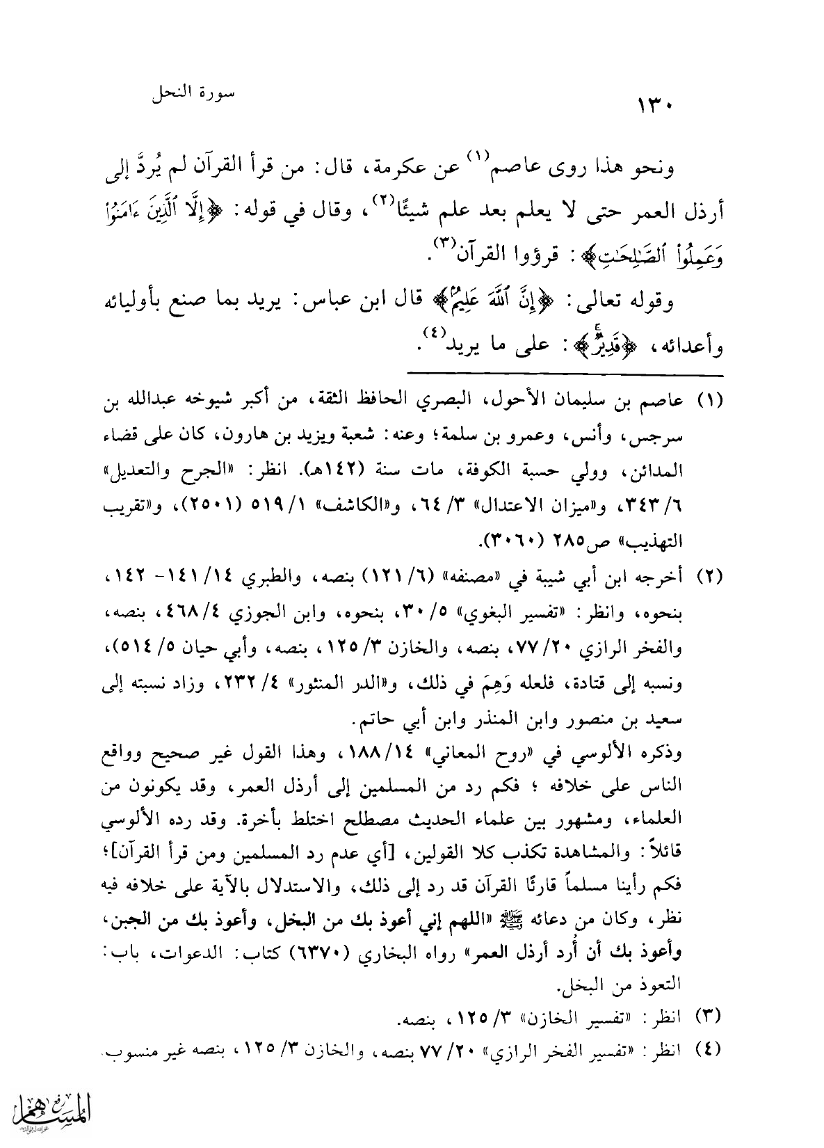 وذكره الألوسي في "روح المعاني" 14/ 188، وهذا القول غير صحيح وواقع الناس على خلافه؛ فكم رد من المسلمين إلى أرذل العمر، وقد يكونون من العلماء، ومشهور بين علماء الحديث مصطلح اختلط بأخرة. وقد رده الألوسي قائلاً: والمشاهدة تكذب كلا القولين، [أي عدم رد المسلمين ومن قرأ القرآن]؛ فكم رأينا مسلمًا قارئًا القرآن قد رد إلى ذلك، والاستدلال بالآية على خلافه فيه نظر، وكان من دعائه -صلى الله عليه وسلم- "اللهم إني أعوذ بك من البخل، وأعوذ بك من الجبن، وأعوذ بك أن أُرد أرذل العمر" رواه البخاري (6370) كتاب: الدعوات، باب: التعوذ من البخل.