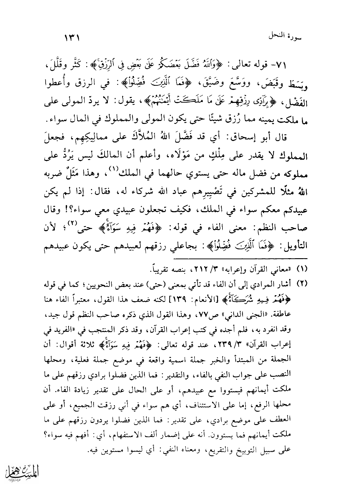 قال أبو إسحاق: أي قد فَضَّلَ اللهُ المُلاَّكَ على ممالِيكِهِم، فجعلَ المملوك لا يقدر على مِلْكٍ من مَوْلَاه، وأعلم أن المالكَ ليس يَرُدُّ على مملوكه من فضل ماله حتى يستوي حالهما في الملك (¬1)، وهذا مَثَلٌ ضربه اللهُ مثلًا للمشركين في تَصْيِيرِهم عباد الله شركاء له، فقال: إذا لم يكن عبيدكم معكم سواء في الملك، فكيف تجعلون عبيدي معي سواء؟! وقال صاحب النظم: معنى الفاء في قوله: {فَهُمْ فِيهِ سَوَاءٌ} حتى (¬2)؛ لأن التأويل: {فَمَا الَّذِينَ فُضِّلُوا}: بجاعلي رزقهم لعبيدهم حتى يكون عبيدهم