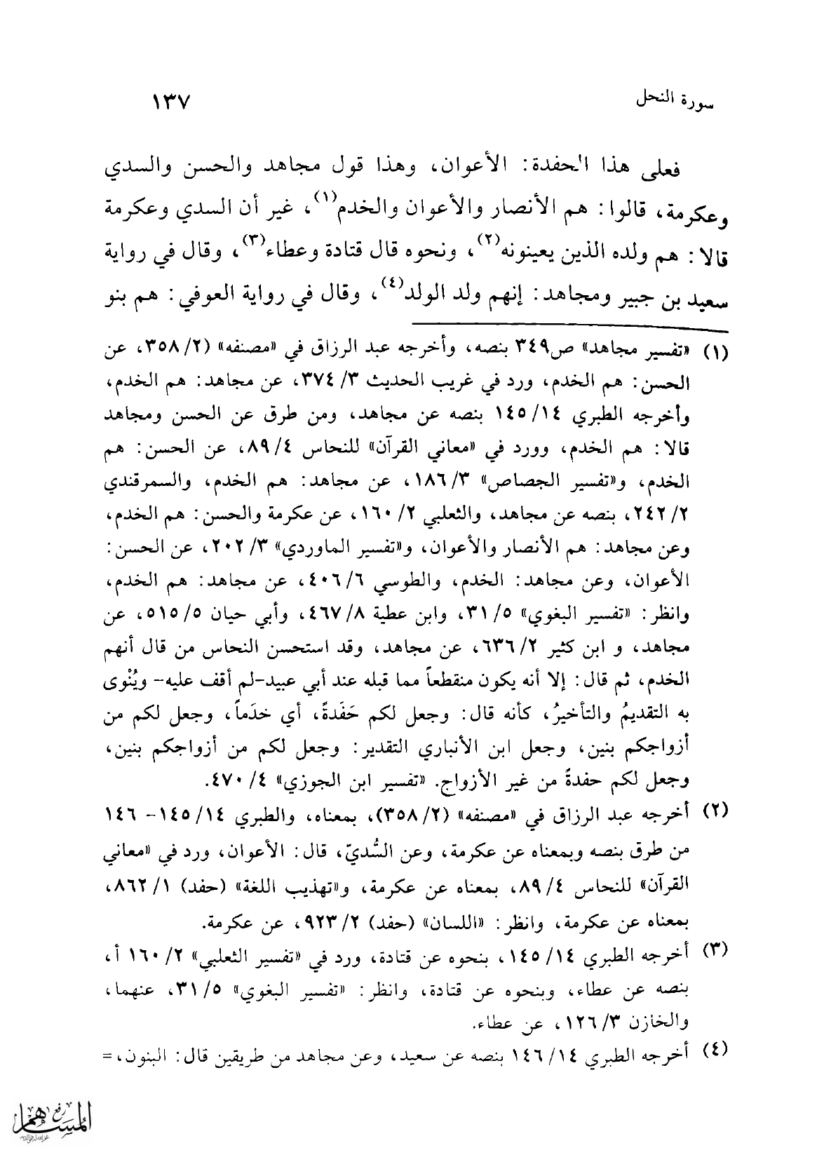 (¬1) "تفسير مجاهد" ص 349 بنصه، وأخرجه عبد الرزاق في "مصنفه" (2/ 358، عن الحسن: هم الخدم، ورد في غريب الحديث 3/ 374، عن مجاهد: هم الخدم، وأخرجه الطبري 14/ 145 بنصه عن مجاهد، ومن طرق عن الحسن ومجاهد قالا: هم الخدم، وورد في "معاني القرآن" للنحاس 4/ 89، عن الحسن: هم الخدم، و"تفسير الجصاص" 3/ 186، عن مجاهد: هم الخدم، والسمرقندي 2/ 242، بنصه عن مجاهد، والثعلبي 2/ 160، عن عكرمة والحسن: هم الخدم، وعن مجاهد: هم الأنصار والأعوان، و"تفسير الماوردي" 3/ 202، عن الحسن: الأعوان، وعن مجاهد: الخدم، والطوسي 6/ 406، عن مجاهد: هم الخدم، وانظر: "تفسير البغوي" 5/ 31، وابن عطية 8/ 467، وأبي حيان 5/ 515، عن مجاهد، وابن كثير 2/ 636، عن مجاهد، وقد استحسن النحاس من قال أنهم الخدم، ثم قال: إلا أنه يكون منقطعًا مما قبله عند أبي عبيد -لم أقف عليه- وُينْوى به التقديمُ والتأخيرُ، كأنه قال: وجعل لكم حَفَدةً، أي خدَماً، وجعل لكم من أزواجكم بنين، وجعل ابن الأنباري التقدير: وجعل لكم من أزواجكم بنين، وجعل لكم حفدةً من غير الأزواج. "تفسير ابن الجوزي" 4/ 470.