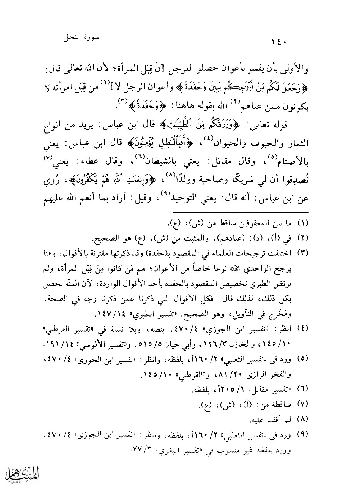 (¬3) اختلفت ترجيحات العلماء في المقصود بـ (حفدة) وقد ذكرتها مقترنة بالأقوال، وهنا يرجح الواحدي رحمه الله نوعًا خاصًا من الأعوان؛ هم مَنْ كانوا مِنْ قِبَل المرأة، ولم يرتض الطبري تخصيص المقصود بالحفدة بأحد الأقوال الواردة؛ لأن المنّة تحصل بكل ذلك، لذلك قال: فكل الأقوال التي ذكرنا عمن ذكرنا وجه في الصحة، ومَخْرج في التأويل، وهو الصحيح. "تفسير الطبري" 14/ 147.