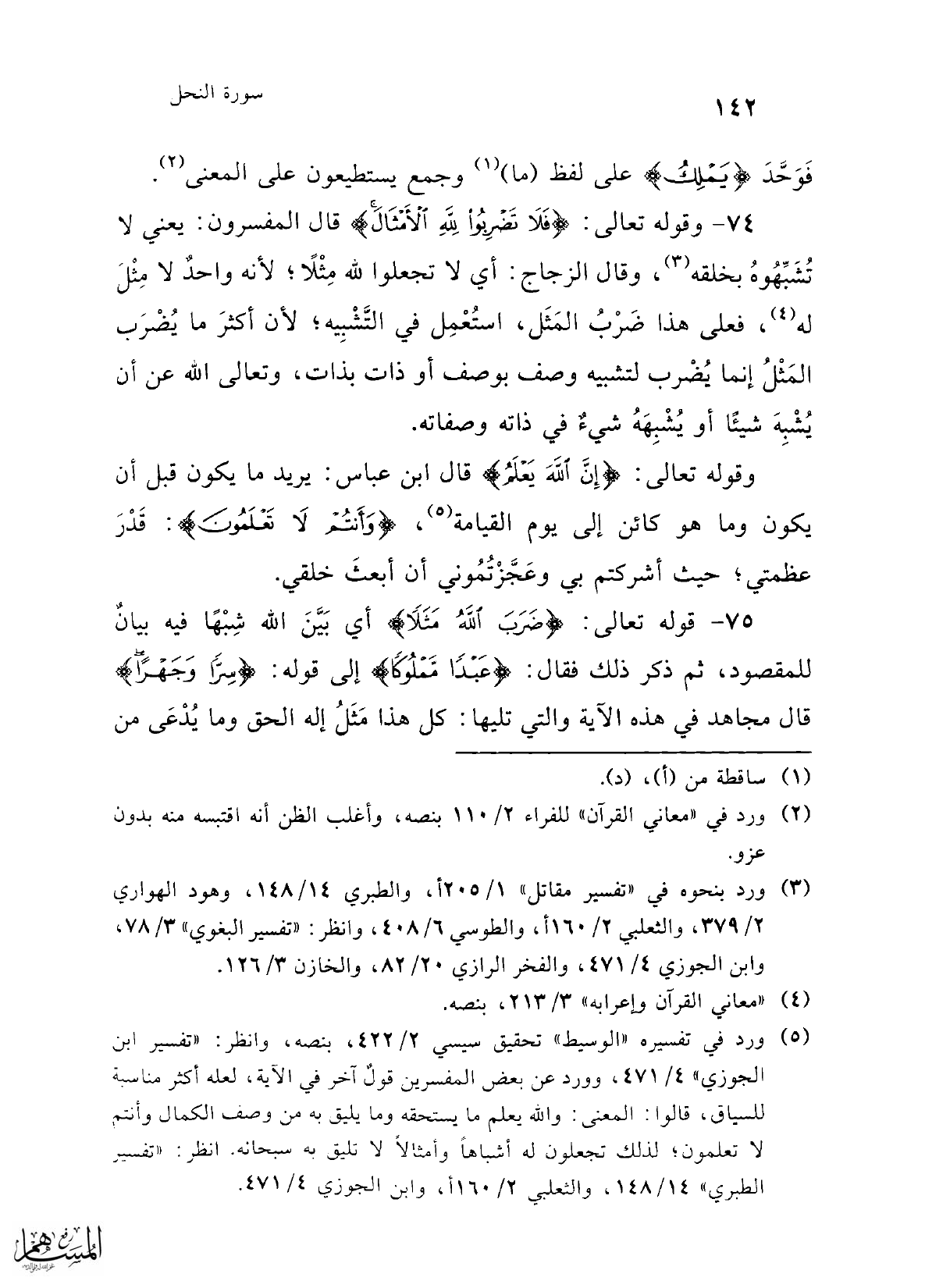 (¬5) ورد في تفسيره "الوسيط" تحقيق سيسي 2/ 422، بنصه، وانظر: "تفسير ابن الجوزي" 4/ 471، وورد عن بعض المفسرين قولٌ آخر في الآية، لعله أكثر مناسبة للسياق، قالوا: المعنى: والله يعلم ما يستحقه وما يليق به من وصف الكمال وأنتم لا تعلمون؛ لذلك تجعلون له أشباهًا وأمثالاً لا تليق به سبحانه. انظر: "تفسير الطبري" 14/ 148، والشعبي 2/ 160 أ، وابن الجوزى 4/ 471.