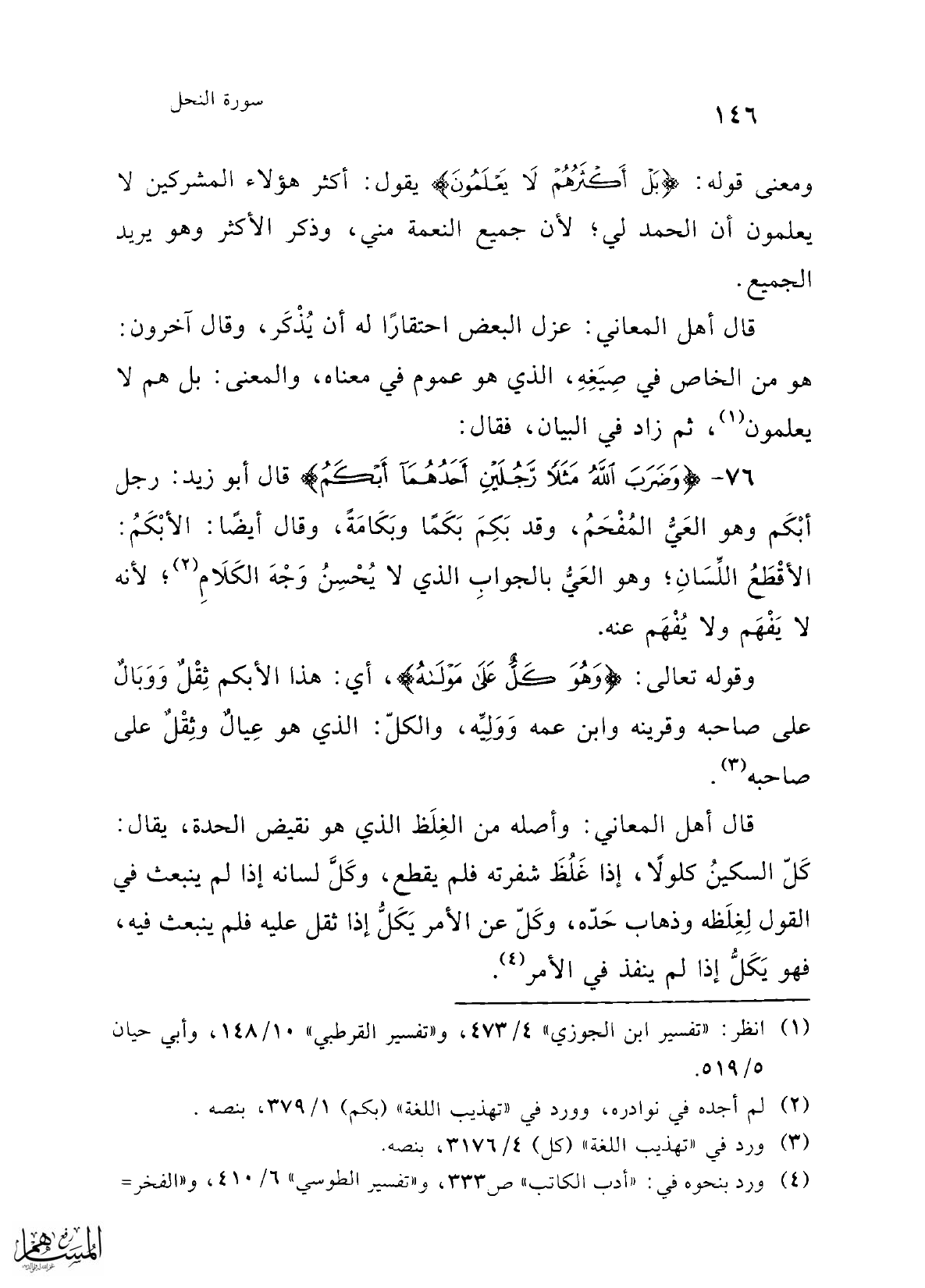76 - {وَضَرَبَ الله مَثَلًا رَجُلَيْنِ} قال أبو زيد: رجل أبْكَم وهو العَيُّ المُفْحَمُ، وقد بَكِمَ بَكَمًا وبَكَامَةً، وقال أيضًا: الأبْكَمُ: الأقْطَعُ اللِّسَانِ؛ وهو العَيُّ بالجوابِ الذي لا يُحْسِنُ وَجْهَ الكَلَامِ (¬2)؛ لأنه لا يَفْهَم ولا يُفْهَم عنه.