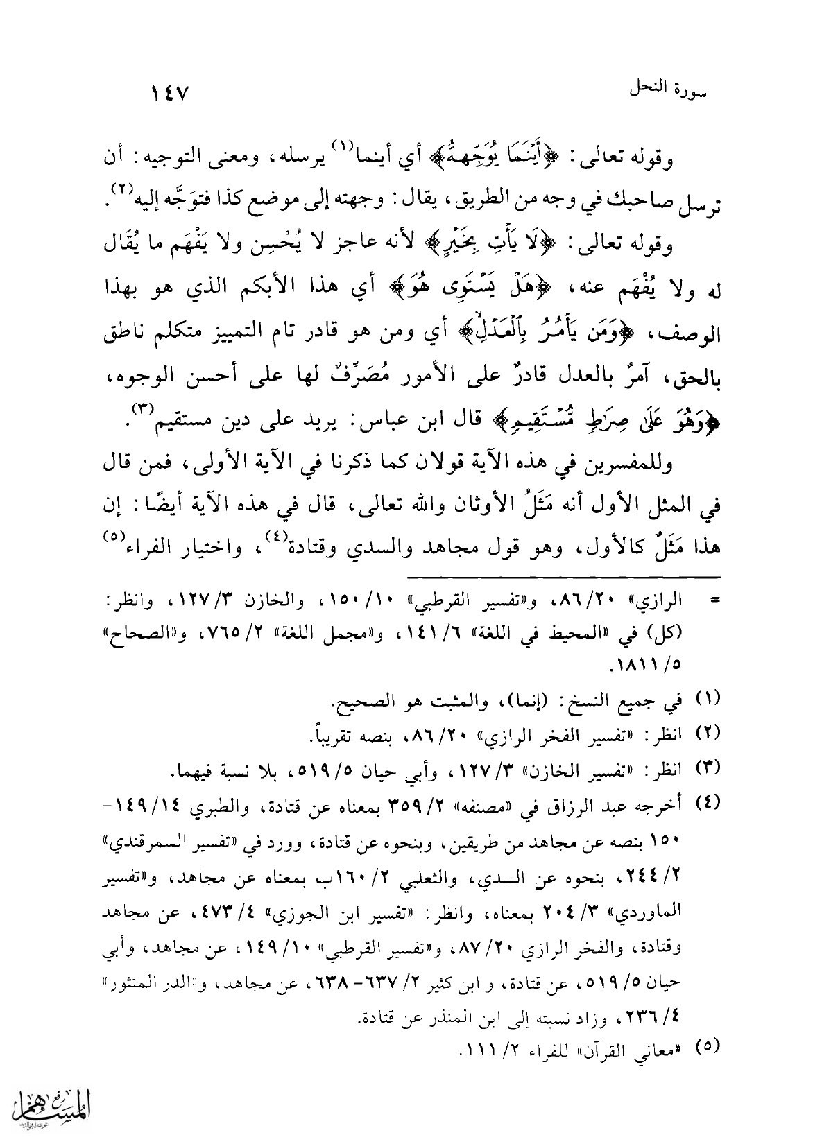 وقوله تعالى: {أَيْنَمَا يُوَجِّهْهُ} أي أينما (¬1) يرسله، ومعنى التوجيه: أن ترسل صاحبك في وجه من الطريق، يقال: وجهته إلى موضع كذا فتوَجَّه إليه (¬2).