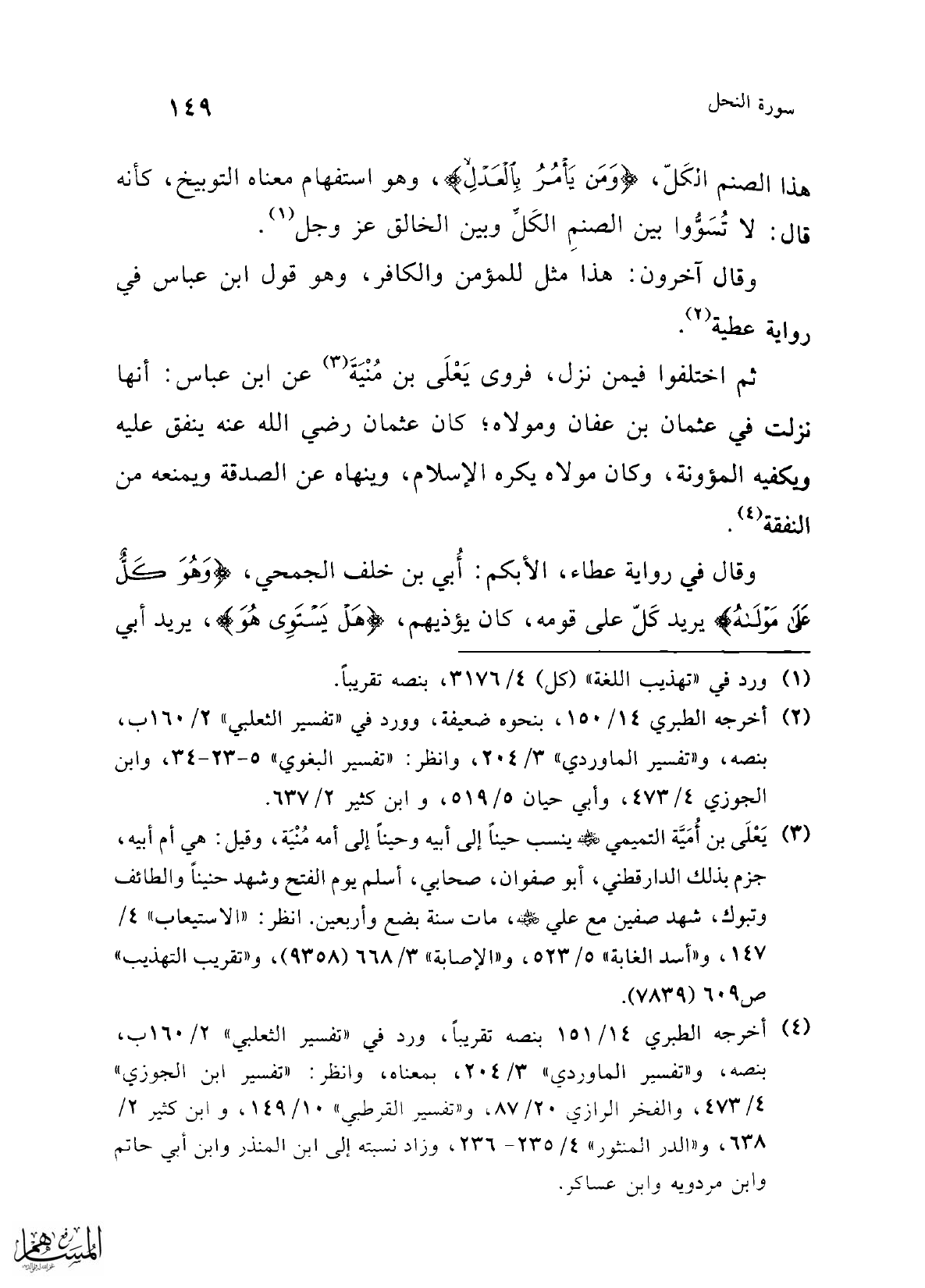 وقال في رواية عطاء، الأبكم: أُبي بن خلف الجمحي، {وَهُوَ كَلٌّ عَلَى مَوْلَاهُ} يريد كَلّ على قومه، كان يؤذيهم، {هَلْ يَسْتَوِي هُوَ}، يريد أبي
