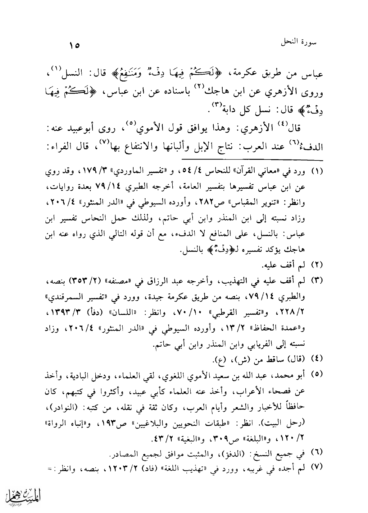 عباس من طريق عكرمة، {لَكُمْ فِيهَا دِفْءٌ وَمَنَافِعُ} قال: النسل (¬1)، وروى الأزهري عن ابن هاجك (¬2) بإسناده عن ابن عباس، {لَكُمْ فِيهَا دِفْءٌ} قال: نسل كل دابة (¬3).