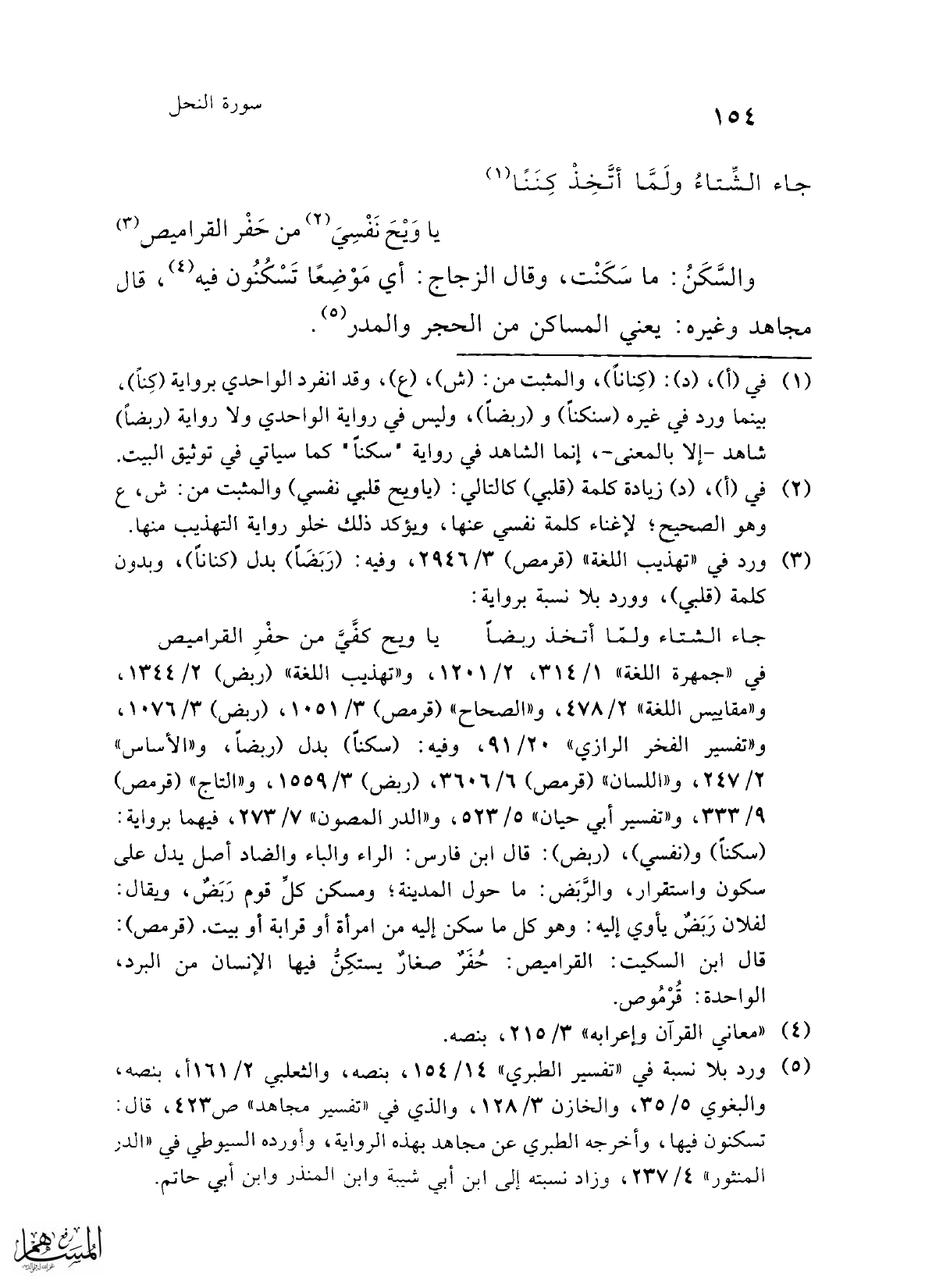 (¬1) في (أ)، (د): (كِنانًا)، والمثبت من: (ش)، (ع)، وقد انفرد الواحدي برواية (كِنًا)، بينما ورد في غيره (سنكنًا) و (ربضًا)، وليس في رواية الواحدي ولا رواية (ربضًا) شاهد -إلا بالمعنى-، إنما الشاهد في رواية "سكنًا" كما سيأتي في توثيق البيت.