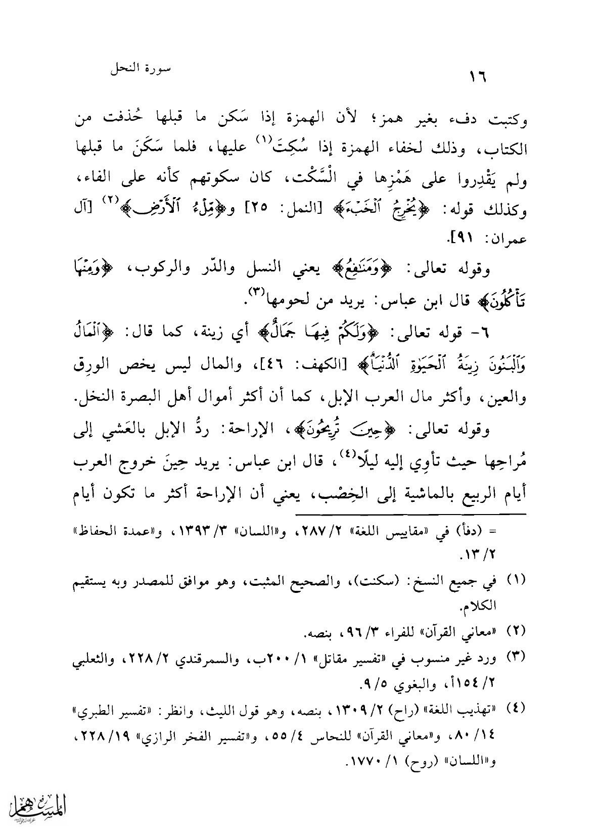 وكتبت دفء بغير همز؛ لأن الهمزة إذا سَكن ما قبلها حُذفت من الكتاب، وذلك لخفاء الهمزة إذا سُكِتَ (¬1) عليها، فلما سَكَنَ ما قبلها ولم يَقْدِروا على هَمْزِها في الْسَّكْت، كان سكوتهم كأنه على الفاء، وكذلك قوله: {يُخْرِجُ الْخَبْءَ} [النمل: 25] و {مِلْءُ الْأَرْضِ} [آل عمران: 91] (¬2).
