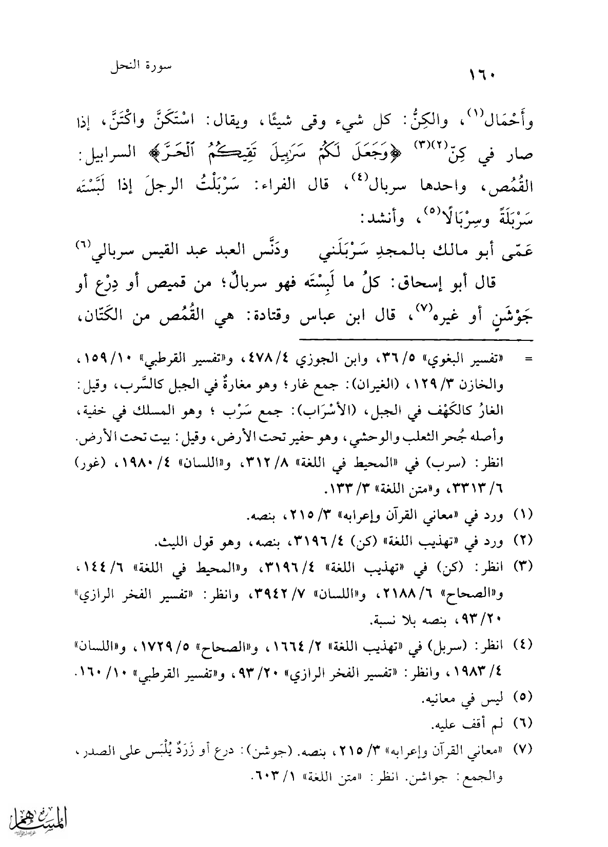 (¬4) انظر: (سربل) في "تهذيب اللغة" 2/ 1664، و"الصحاح" 5/ 1729، و"اللسان" 4/ 1983، وانظر: "تفسير الفخر الرازي" 20/ 93، و"تفسير القرطبي" 10/ 160.