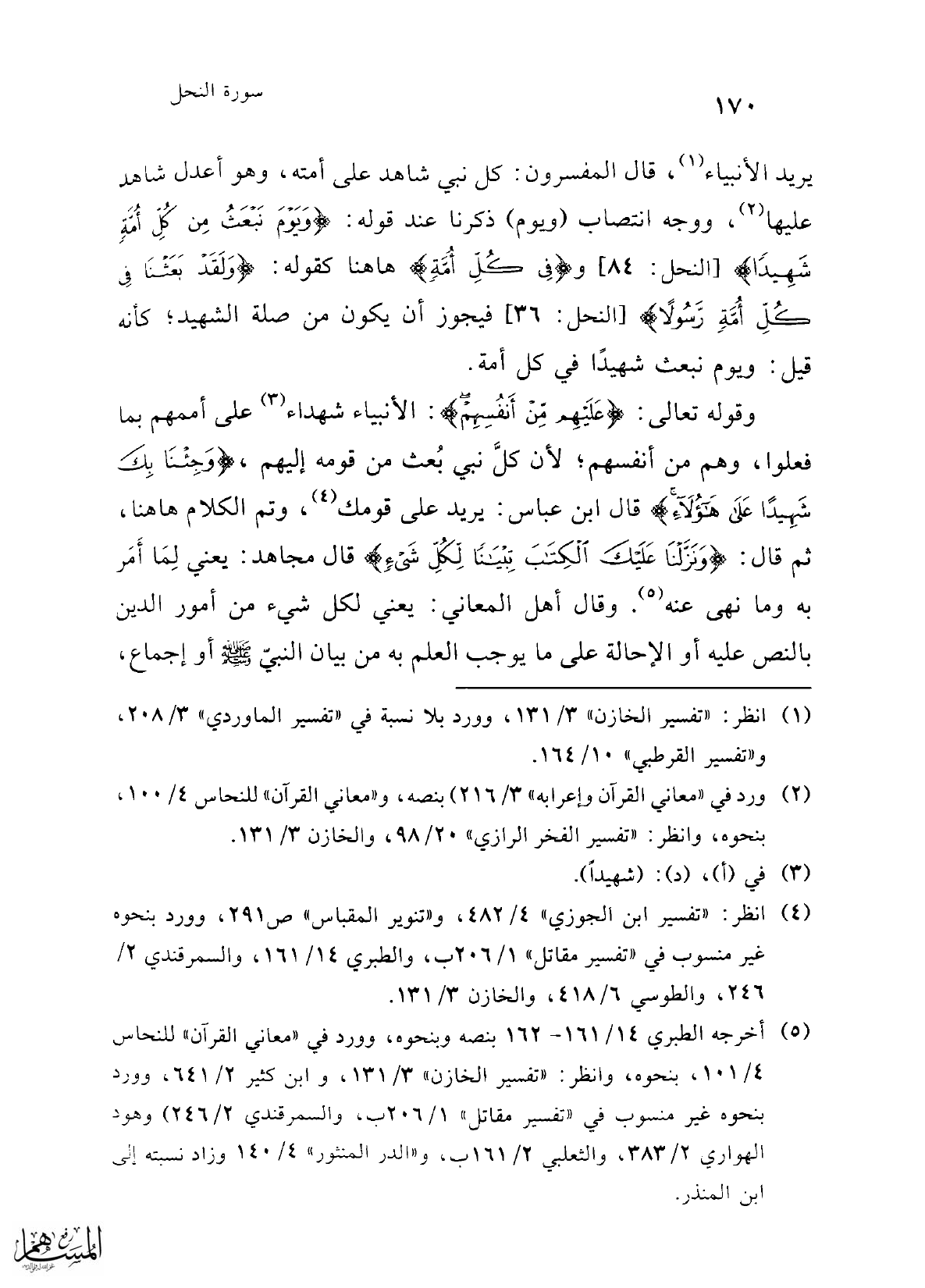 وقوله تعالى: {عَلَيْهِمْ مِنْ أَنْفُسِهِمْ}: الأنبياء شهداء (¬3) على أممهم بما فعلوا، وهم من أنفسهم؛ لأن كلَّ نبي بُعث من قومه إليهم، {وَجِئْنَا بِكَ شَهِيدًا عَلَى هَؤُلَاءِ} قال ابن عباس: يريد على قومك (¬4)، وتم الكلام هاهنا، ثم قال: {وَنَزَّلْنَا عَلَيْكَ الْكِتَابَ تِبْيَانًا لِكُلِّ شَيْءٍ} قال مجاهد: يعني لِمَا أَمَر به وما نهى عنه (¬5). وقال أهل المعاني: يعني لكل شيء من أمور الدين بالنص عليه أو الإحالة على ما يوجب العلم به من بيان النبيّ -صلى الله عليه وسلم- أو إجماع،
