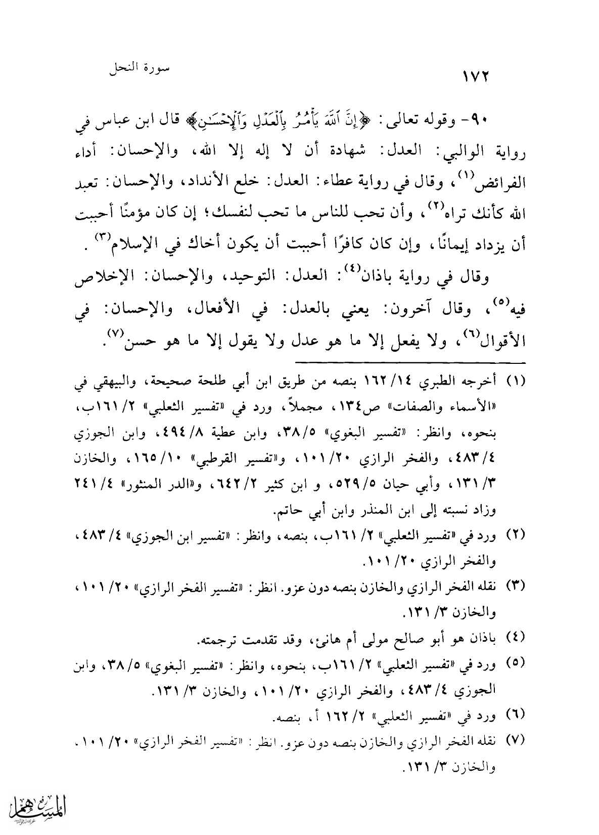 90 - وقوله تعالى: {إِنَّ اللَّهَ يَأْمُرُ بِالْعَدْلِ وَالْإِحْسَانِ} قال ابن عباس في رواية الوالبي: العدل: شهادة أن لا إله إلا الله، والإحسان: أداء الفرائض (¬1)، وقال في رواية عطاء: العدل: خلع الأنداد، والإحسان: تعبد الله كأنك تراه (¬2)، وأن تحب للناس ما تحب لنفسك. إن كان مؤمنًا أحببت أن يزداد إيمانًا، وإن كان كافرًا أحببت أن يكون أخاك في الإسلام (¬3).