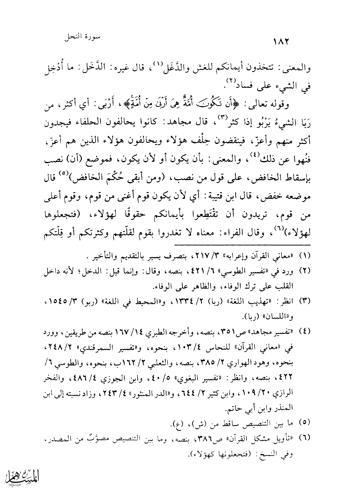 وقوله تعالى: {أَنْ تَكُونَ أُمَّةٌ هِيَ أَرْبَى مِنْ أُمَّةٍ}، أَرْبَى: أي أكثر، من رَبَا الشيءُ يَرْبُو إذا كثر (¬3)، قال مجاهد: كانوا يحالفون الحلفاء فيجدون أكثر منهم وأعزّ، فينقضون حِلْف هؤلاء ويحالفون هؤلاء الذين هم أعزّ، فنُهوا عن ذلك (¬4)، والمعنى: بأن يكون أو لأن يكون، فموضع (أن) نصب بإسقاط الخافض، على قول من نصب، (ومن أبقى حُكْمَ الخافض) (¬5) قال موضعه خفض، قال ابن قتيبة: أي لأن يكون قوم أغنى من قوم، وقوم أعلى من قوم، تريدون أن تقْتَطِعوا بأيمانكم حقوقًا لهؤلاء، (فتجعلوها لهؤلاء) (¬6)، وقال الفراء: معناه لا تغدروا بقوم لقلّتهم وكثرتكم أو قِلّتكم