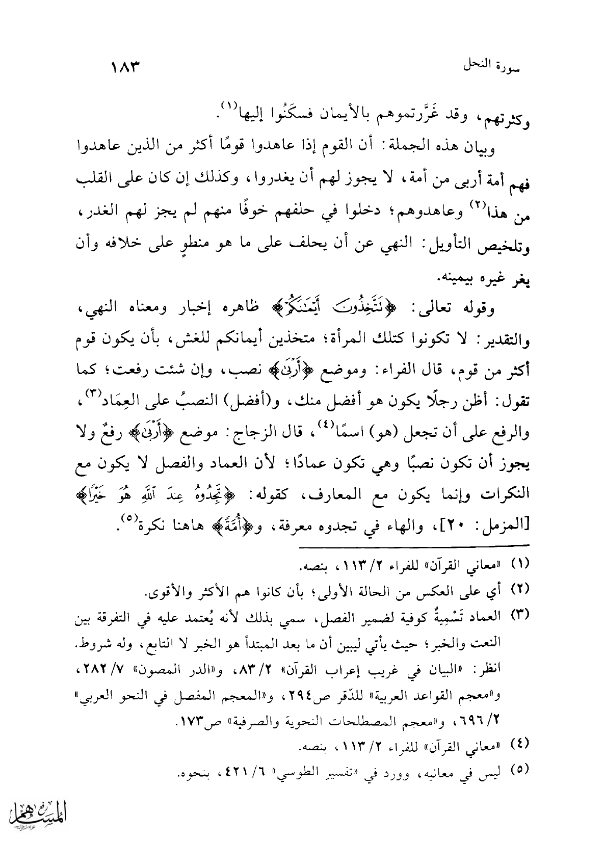 (¬3) العماد تَسْمِيةٌ كوفية لضمير الفصل، سمي بذلك لأنه يُعتمد عليه في التفرقة بين النعت والخبر؛ حيث يأتي ليبين أن ما بعد المبتدأ هو الخبر لا التابع، وله شروط. انظر: "البيان في غريب إعراب القرآن" 2/ 83، و"الدر المصون" 7/ 282، و"معجم القواعد العربية" للدّقر ص294، و"المعجم المفصل في النحو العربي" 2/ 696، و"معجم المصطلحات النحوية والصرفية" ص 173.