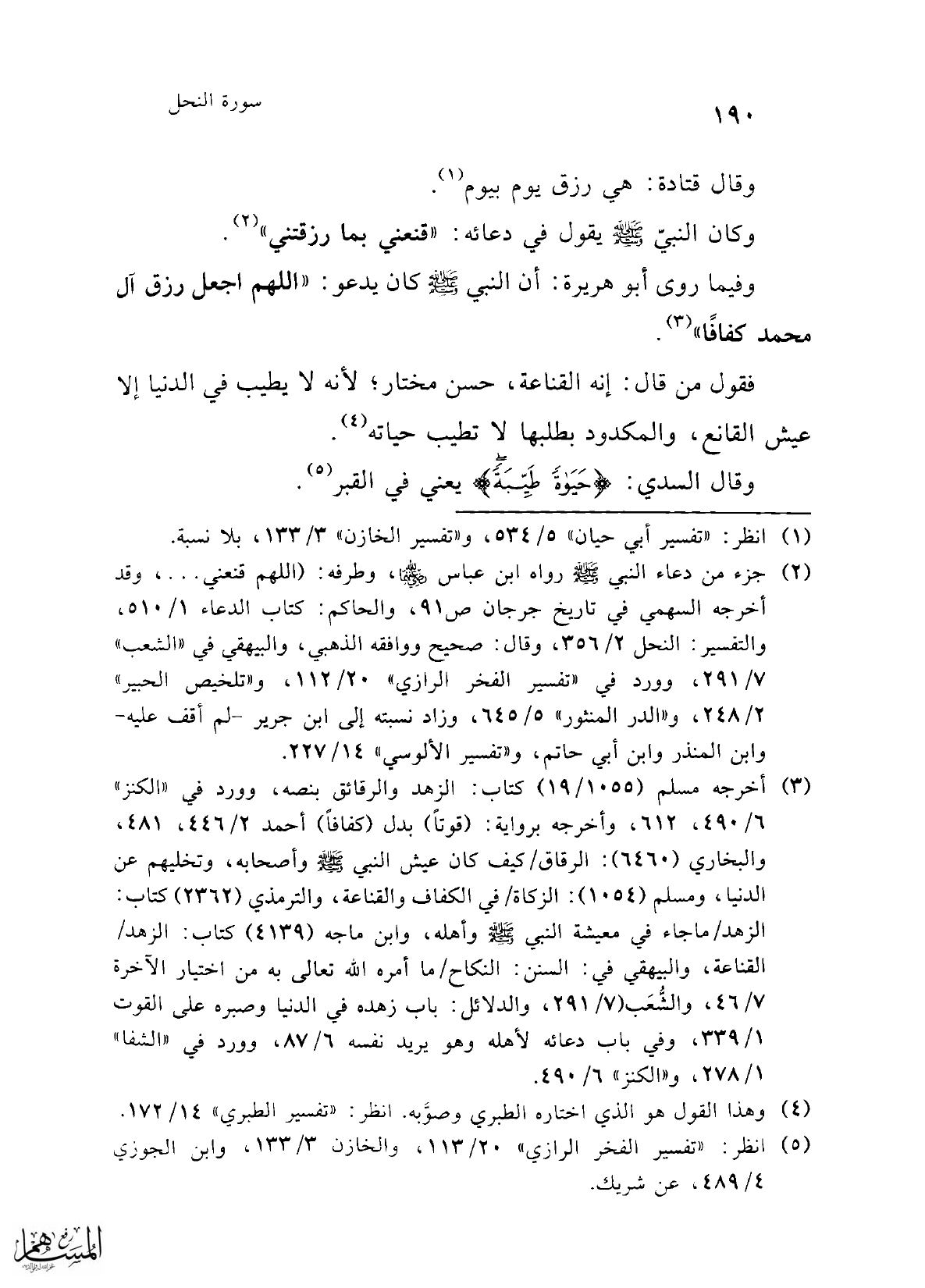 (¬2) جزء من دعاء النبي -صلى الله عليه وسلم- رواه ابن عباس -رضي الله عنه-، وطرفه: (اللهم قنعني ... ، وقد أخرجه السهمي في تاريخ جرجان ص 91، والحاكم: كتاب الدعاء 1/ 510، والتفسير: النحل 2/ 356، وقال: صحيح ووافقه الذهبي، والبيهقي في "الشعب" 7/ 291، وورد في "تفسير الفخر الرازي" 20/ 112، و"تلخيص الحبير" 2/ 248، و"الدر المنثور" 5/ 645، وزاد نسبته إلى ابن جرير -لم أقف عليه- وابن المنذر وابن أبي حاتم، و"تفسير الألوسي" 14/ 227.