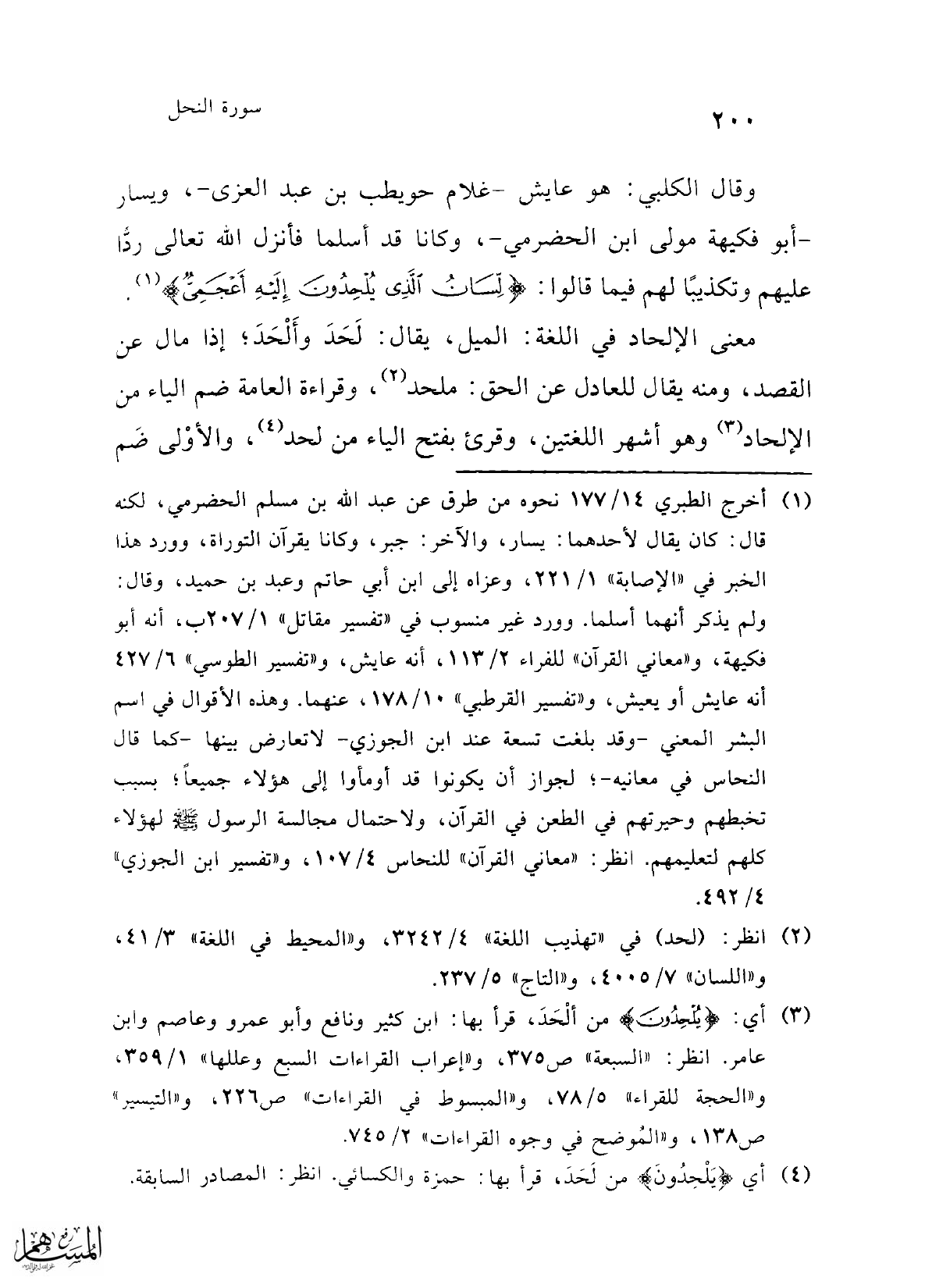 (¬1) أخرج الطبري 14/ 177 نحوه من طرق عن عبد الله بن مسلم الحضرمي، لكنه قال: كان يقال لأحدهما: يسار، والآخر: جبر، وكانا يقرآن التوراة، وورد هذا الخبر في "الإصابة" 1/ 221، وعزاه إلى ابن أبي حاتم وعبد بن حميد، وقال: ولم يذكر أنهما أسلما. وورد غير منسوب في "تفسير مقاتل" 1/ 207ب، أنه أبو فكيهة، و"معاني القرآن" للفراء 2/ 113، أنه عايش، و"تفسير الطوسي" 6/ 427 أنه عايش أو يعيش، و"تفسير القرطبي" 10/ 178، عنهما. وهذه الأقوال في اسم البشر المعني -وقد بلغت تسعة عند ابن الجوزي- لاتعارض بينها -كما قال النحاس في معانيه-؛ لجواز أن يكونوا قد أومأوا إلى هؤلاء جميعًا؛ بسبب تخبطهم وحيرتهم في الطعن في القرآن، ولاحتمال مجالسة الرسول -صلى الله عليه وسلم- لهؤلاء كلهم لتعليمهم. انظر: "معاني القرآن" للنحاس 4/ 107، و"تفسير ابن الجوزي" 4/ 492.