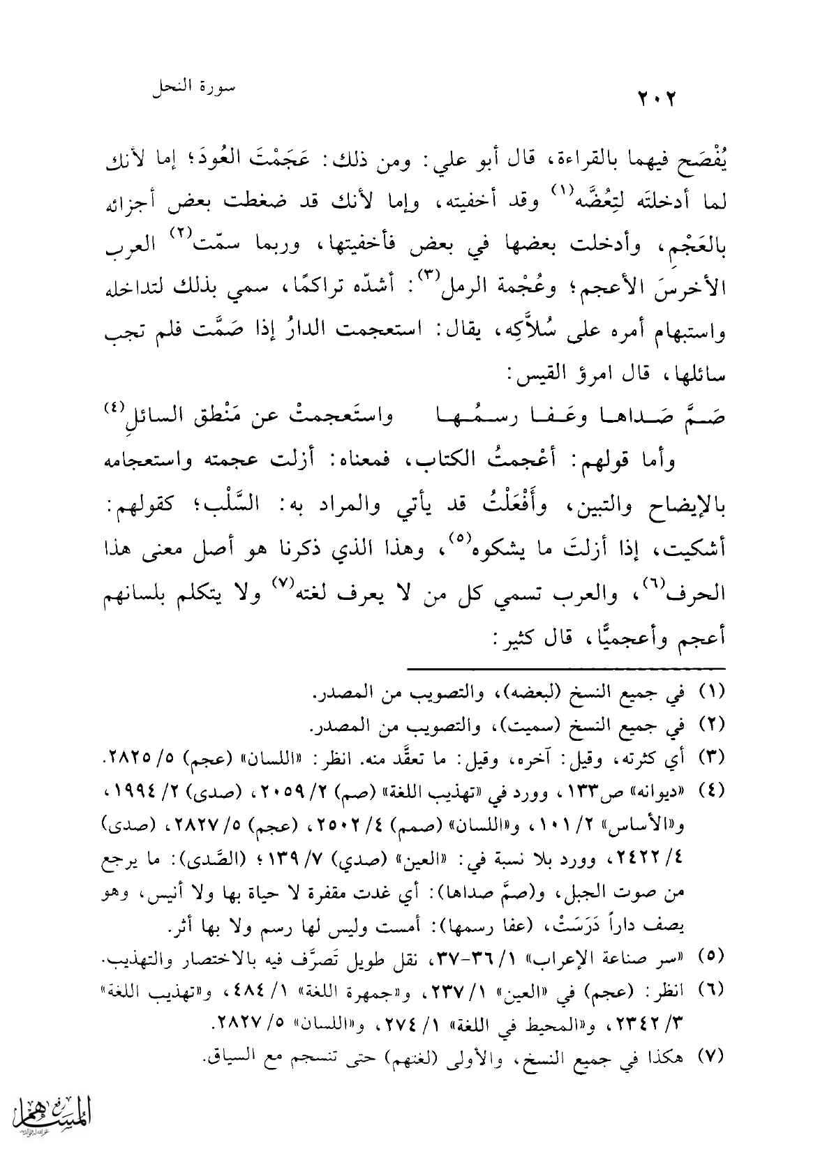 (¬6) انظر: (عجم) في "العين" 1/ 237، و"جمهرة اللغة" 1/ 484، و"تهذيب اللغة" 3/ 2342، و"المحيط في اللغة" 1/ 274، و"اللسان" 5/ 2827.