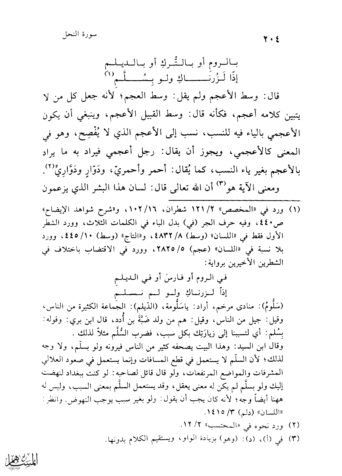 ومعنى الآية هو (¬3) أن الله تعالى قال: لسان هذا البشر الذي يزعمون