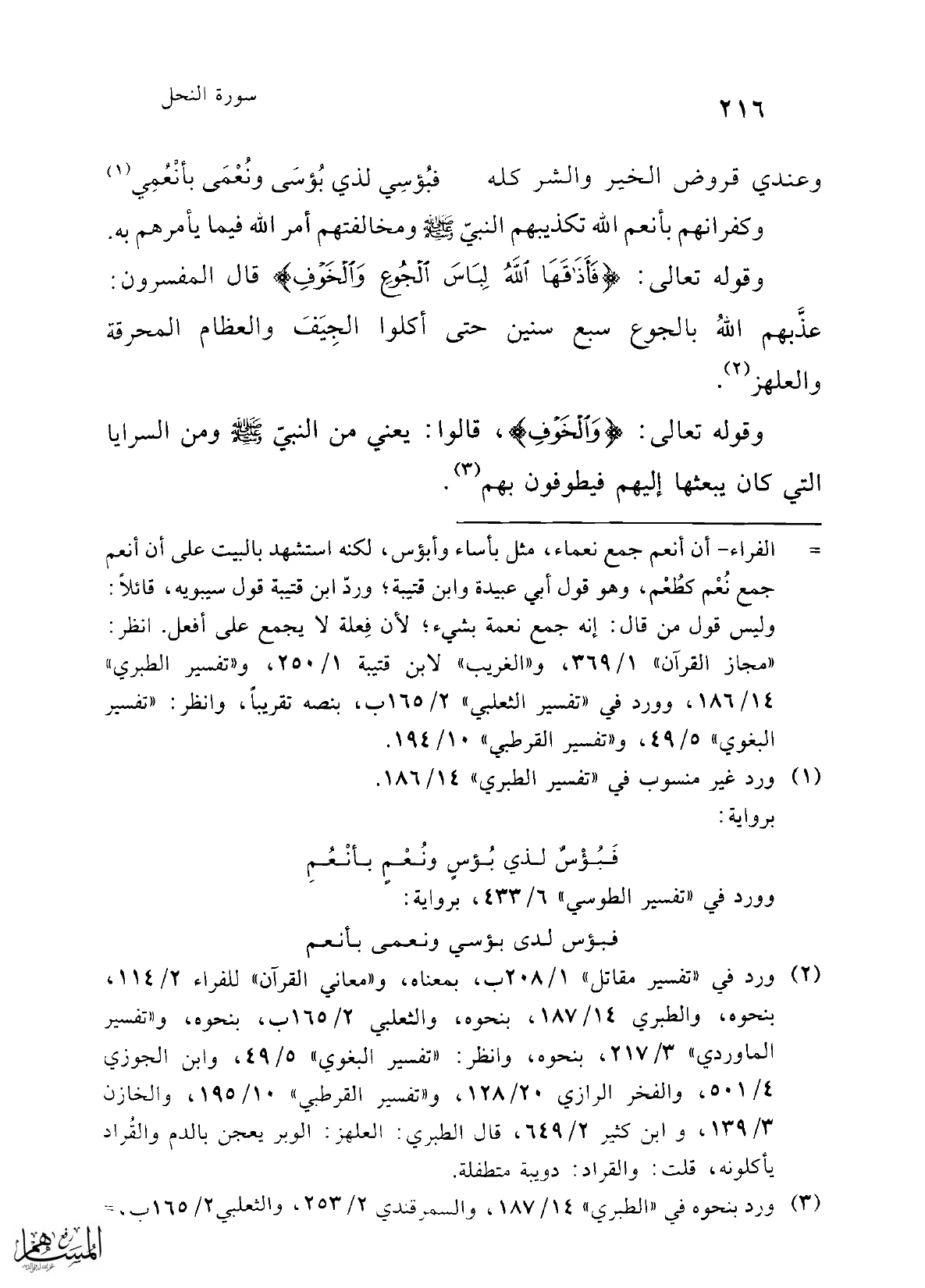 = الفراء- أن أنعم جمع نعماء، مثل بأساء وأبؤس، لكنه استشهد بالبيت على أن أنعم جمع نُعْم كطُعْم، وهو قول أبي عبيدة وابن قتيبة؛ وردّ ابن قتيبة قول سيبويه، قائلاً: وليس قول من قال: إنه جمع نعمة بشيء؛ لأن فِعلة لا يجمع على أفعل. انظر: "مجاز القرآن" 1/ 369، و"الغريب" لابن قتيبة 1/ 250، و"تفسير الطبري" 14/ 186، وورد في "تفسير الثعلبي" 2/ 165 ب، بنصه تقريبًا، وانظر: "تفسير البغوي" 5/ 49، و"تفسير القرطبي" 10/ 194.
