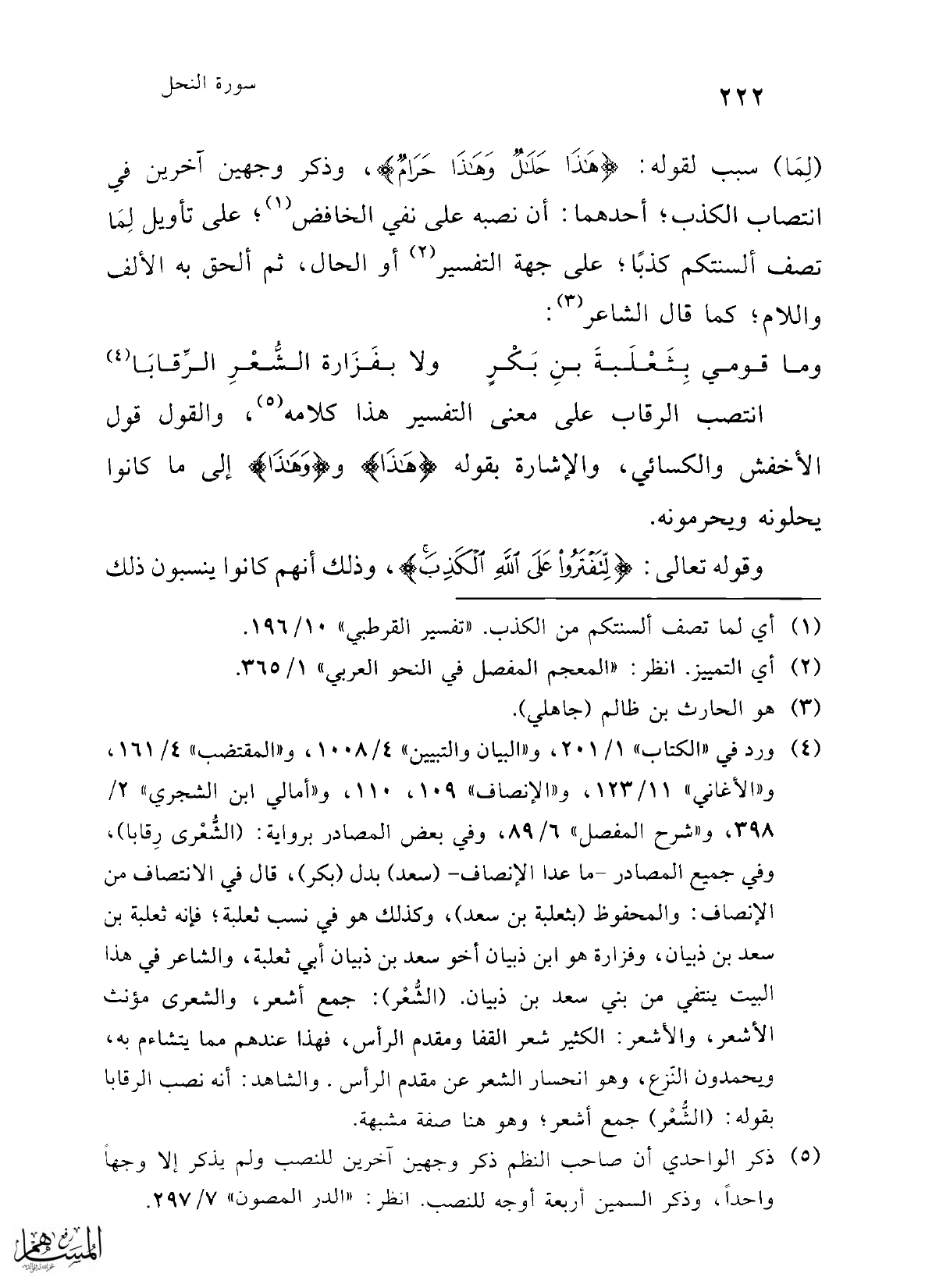 (¬4) ورد في "الكتاب" 1/ 201، و"البيان والتبيين" 4/ 1008، و"المقتضب" 4/ 161، و"الأغاني" 11/ 123، و"الإنصاف" 109، 110، و"أمالي ابن الشجري" 2/ 398، و"شرح المفصل" 6/ 89، وفي بعض المصادر برواية: (الشُّعْرى رِقابا)، وفي جميع المصادر -ما عدا الإنصاف- (سعد) بدل (بكر)، قال في الانتصاف من الإنصاف: والمحفوظ (بثعلبة بن سعد)، وكذلك هو في نسب ثعلبة؛ فإنه ثعلبة بن سعد بن ذبيان، وفزارة هو ابن ذبيان أخو سعد بن ذبيان أبي ثعلبة، والشاعر في هذا البيت ينتفي من بني سعد بن ذبيان. (الشُّعْر): جمع أشعر، والشعرى مؤنث الأشعر، والأشعر: الكثير شعر القفا ومقدم الرأس، فهذا عندهم مما يتشاءم به، ويحمدون النّزع، وهو انحسار الشعر عن مقدم الرأس. والشاهد: أنه نصب الرقابا بقوله: (الشُّعْر) جمع أشعر، وهو هنا صفة مشبهة.
