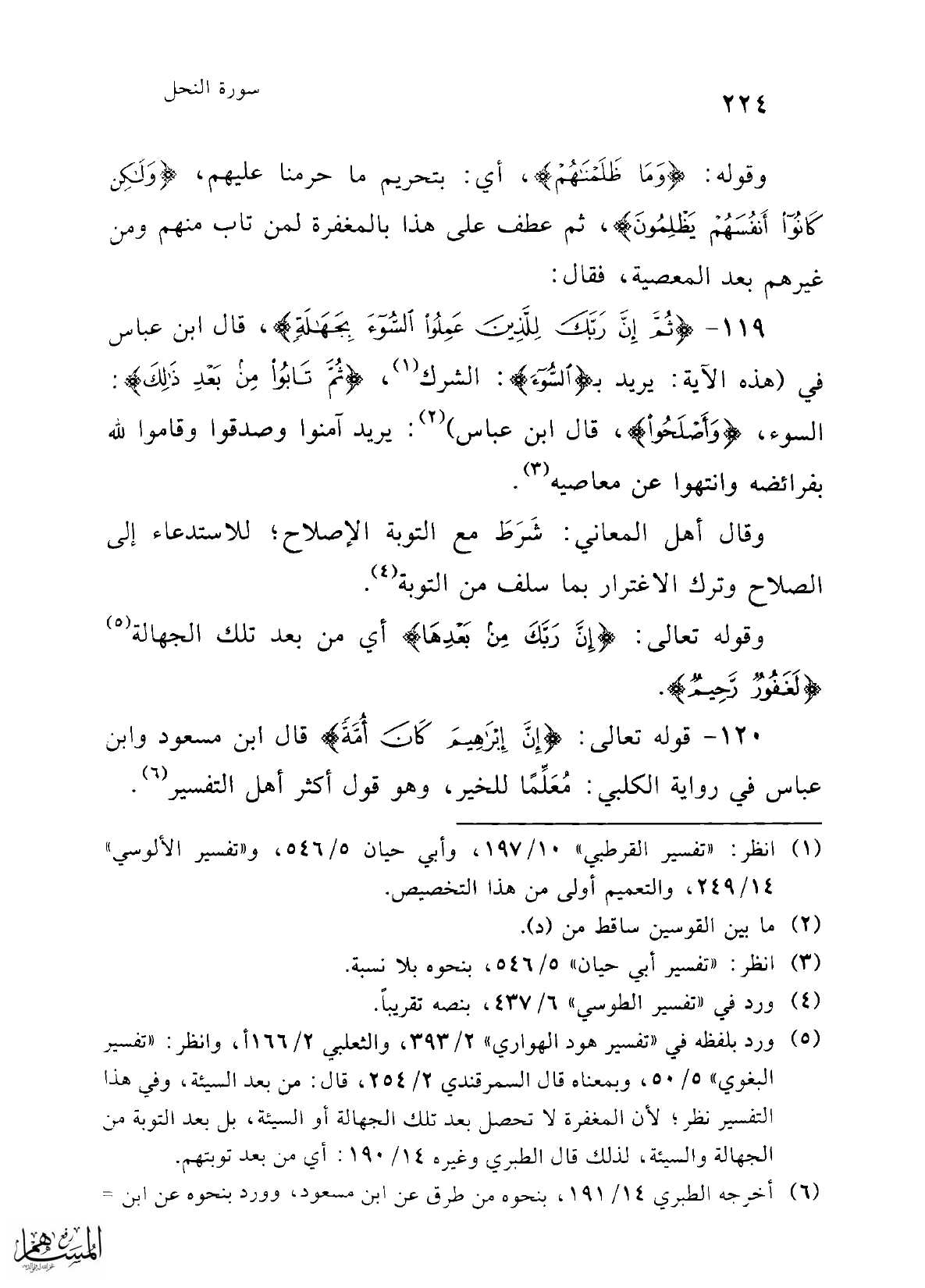 119 - {ثُمَّ إِنَّ رَبَّكَ لِلَّذِينَ عَمِلُوا السُّوءَ بِجَهَالَةٍ}، قال ابن عباس في (هذه الآية: يريد بـ {السُّوءَ}: الشرك (¬1)، {ثُمَّ تَابُوا مِنْ بَعْدِ ذَلِكَ}: السوء، {وَأَصْلَحُوا}، قال ابن عباس) (¬2): يريد آمنوا وصدقوا وقاموا لله بفرائضه وانتهوا عن معاصيه (¬3).