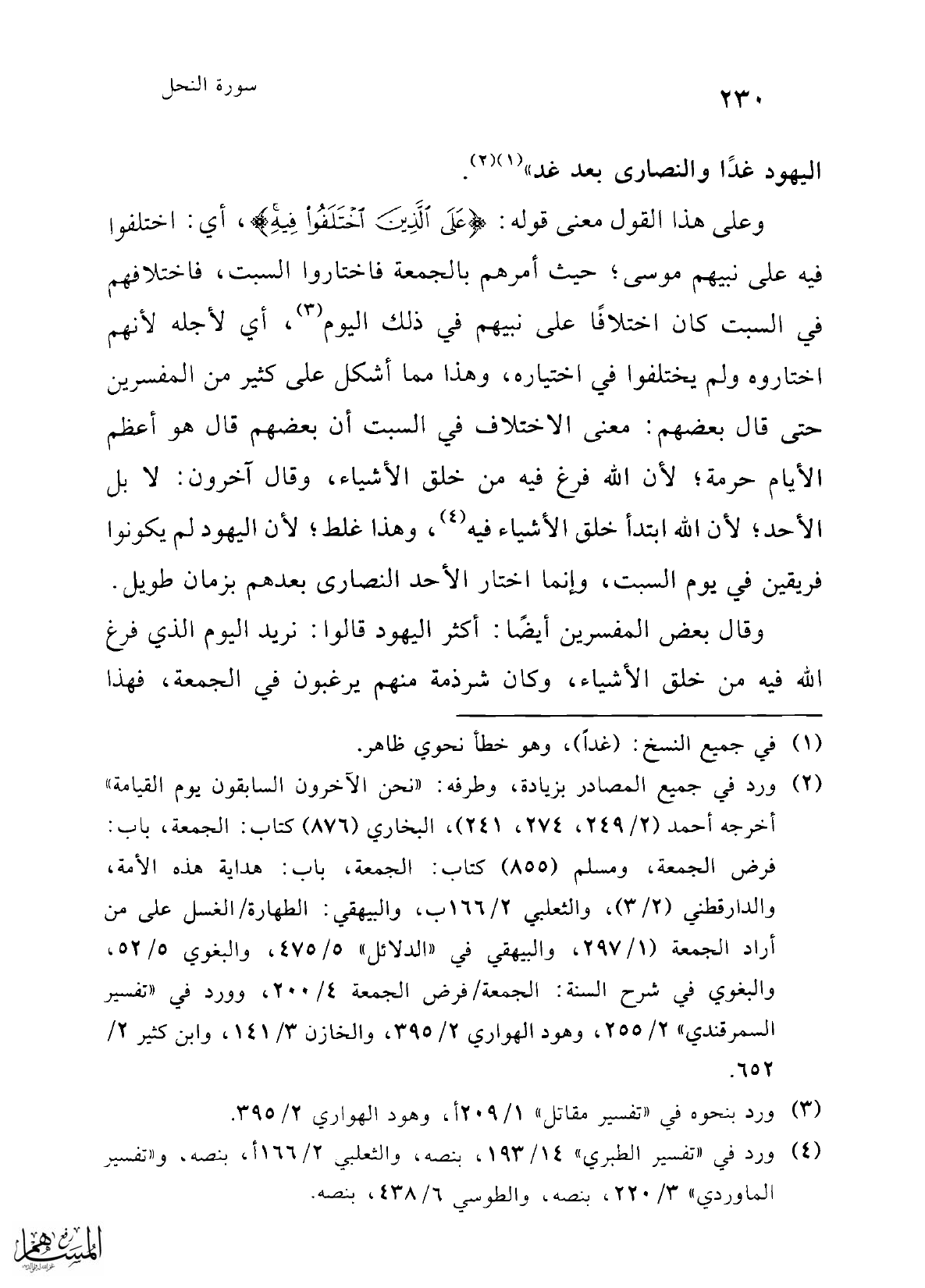 وعلى هذا القول معنى قوله: {عَلَى الَّذِينَ اخْتَلَفُوا فِيهِ}، أي: اختلفوا فيه على نبيهم موسى؛ حيث أمرهم بالجمعة فاختاروا السبت، فاختلافهم في السبت كان اختلافًا على نبيهم في ذلك اليوم (¬3)، أي لأجله لأنهم اختاروه ولم يختلفوا في اختياره، وهذا مما أشكل على كثير من المفسرين حتى قال بعضهم: معنى الاختلاف في السبت أن بعضهم قال هو أعظم الأيام حرمة؛ لأن الله فرغ فيه من خلق الأشياء، وقال آخرون: لا بل الأحد؛ لأن الله ابتدأ خلق الأشياء فيه (¬4)، وهذا غلط؛ لأن اليهود لم يكونوا فريقين في يوم السبت، وإنما اختار الأحد النصارى بعدهم بزمان طويل.