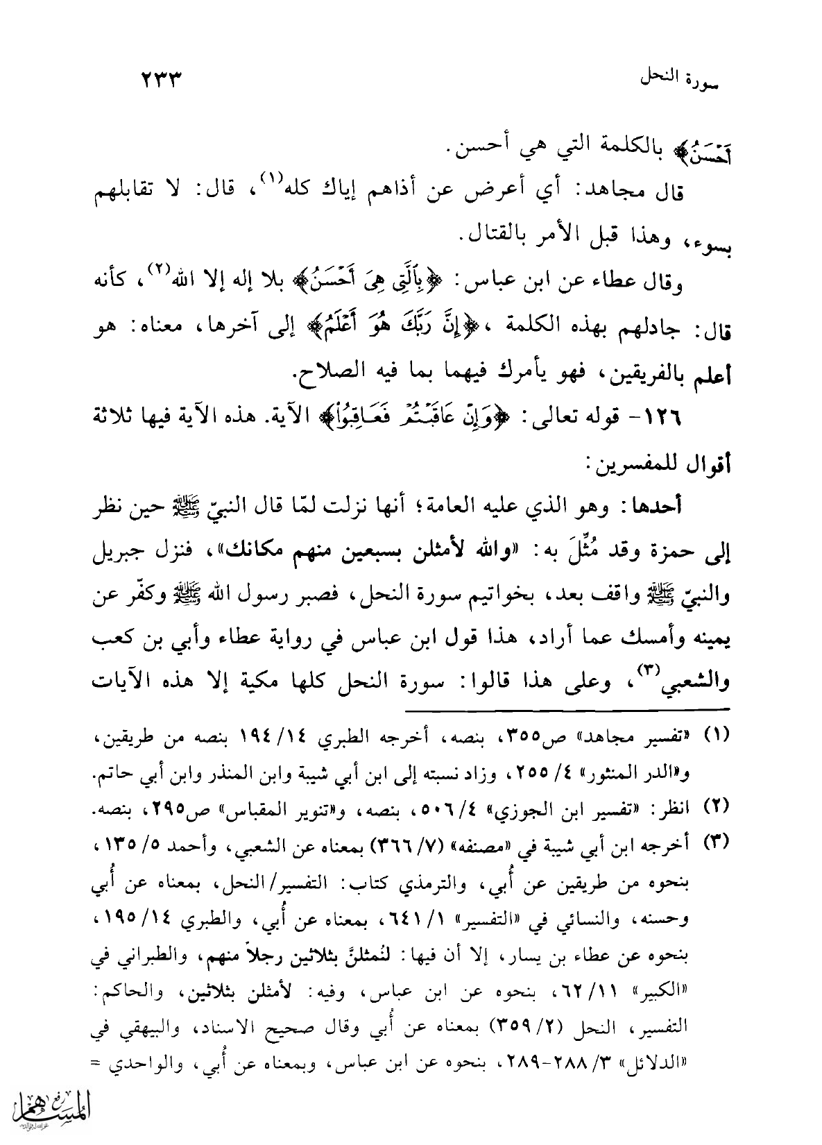 126 - قوله تعالى: {وَإِنْ عَاقَبْتُمْ فَعَاقِبُوا} الآية. هذه الآية فيها ثلاثة أقوال للمفسرين: