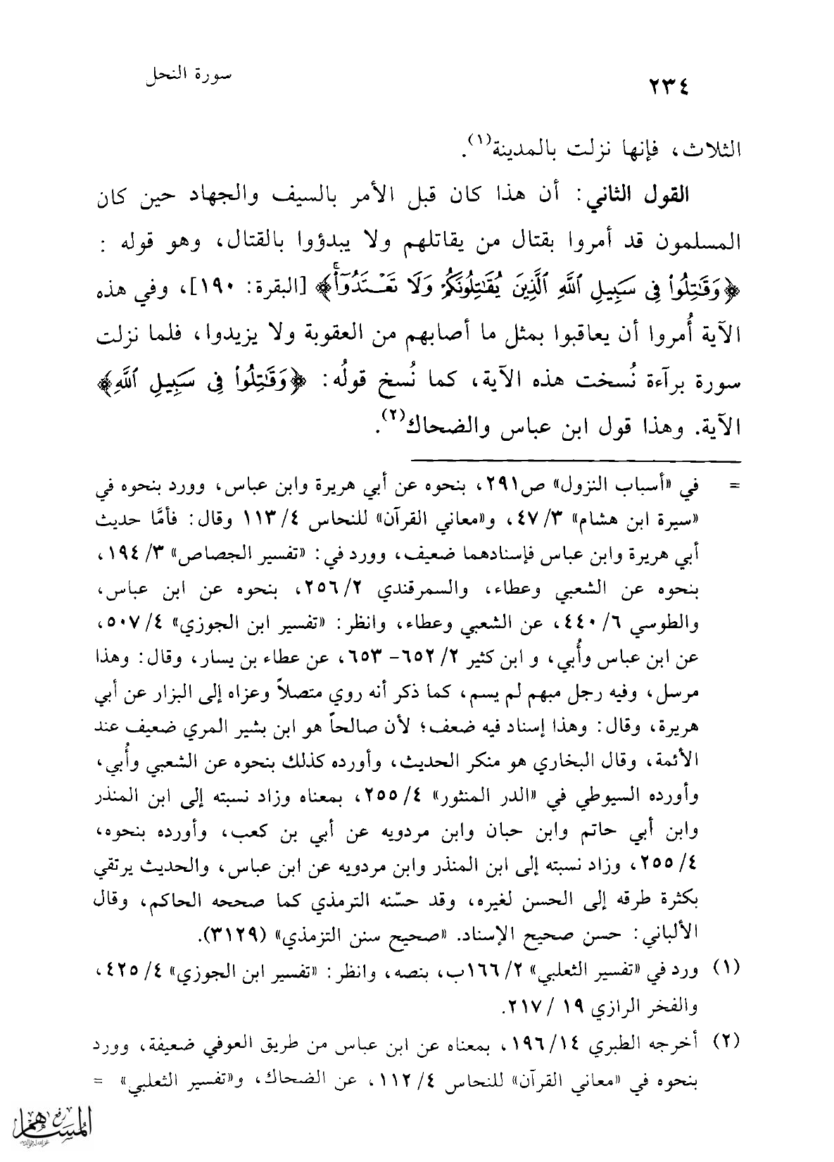 = في "أسباب النزول" ص 291 بنحوه عن أبي هريرة وابن عباس، وورد بنحوه في "سيرة ابن هشام" 3/ 47، و"معاني القرآن" للنحاس 4/ 113 وقال: فأمَّا حديث أبي هريرة وابن عباس فإسنادهما ضعيف، وورد في: "تفسير الجصاص" 3/ 194، بنحوه عن الشعبي وعطاء، والسمرقندي 2/ 256، بنحوه عن ابن عباس، والطوسي 6/ 440، عن الشعبي وعطاء، وانظر: "تفسير ابن الجوزي" 4/ 507، عن ابن عباس وأُبي، وابن كثير 2/ 652 - 653، عن عطاء بن يسار، وقال: وهذا مرسل، وفيه رجل مبهم لم يسم، كما ذكر أنه روي متصلاً وعزاه إلى البزار عن أبي هريرة، وقال: وهذا إسناد فيه ضعف؛ لأن صالحاً هو ابن بشير المري ضعيف عند الأئمة، وقال البخاري هو منكر الحديث، وأورده كذلك بنحوه عن الشعبي وأُبي، وأورده السيوطي في "الدر المنثور" 4/ 255، بمعناه وزاد نسبته إلى ابن المنذر وابن أبي حاتم وابن حبان وابن مردويه عن أبي بن كعب، وأورده بنحوه، 4/ 255، وزاد نسبته إلى ابن المنذر وابن مردويه عن ابن عباس، والحديث يرتقي بكثرة طرقه إلى الحسن لغيره، وقد حسّنه الترمذي كما صححه الحاكم، وقال الألباني: حسن صحيح الإسناد. "صحيح سنن الترمذي" (3129).