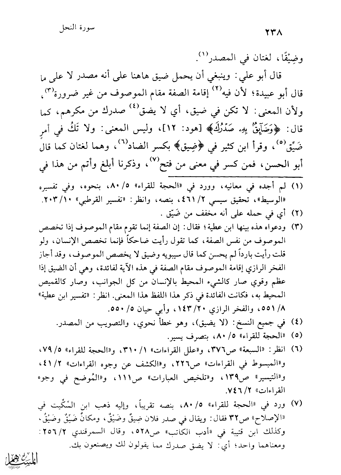 (¬7) ورد في "الحجة للقراء" 5/ 80، بنصه تقريبًا، وإليه ذهب ابن السِّكِّيت في "الإصلاح" ص 32 فقال: ويقال في صدر فلان ضِيقٌ وضَيْق، ومكانٌ ضَيِّقٌ وضَيْقٌ، وكذلك ابن قتيبة في "أدب الكاتب" ص 528، وقال السمرقندي 2/ 256: ومعناهما واحد؛ أي: لا يضق صدرك مما يقولون لك ويصنعون بك.