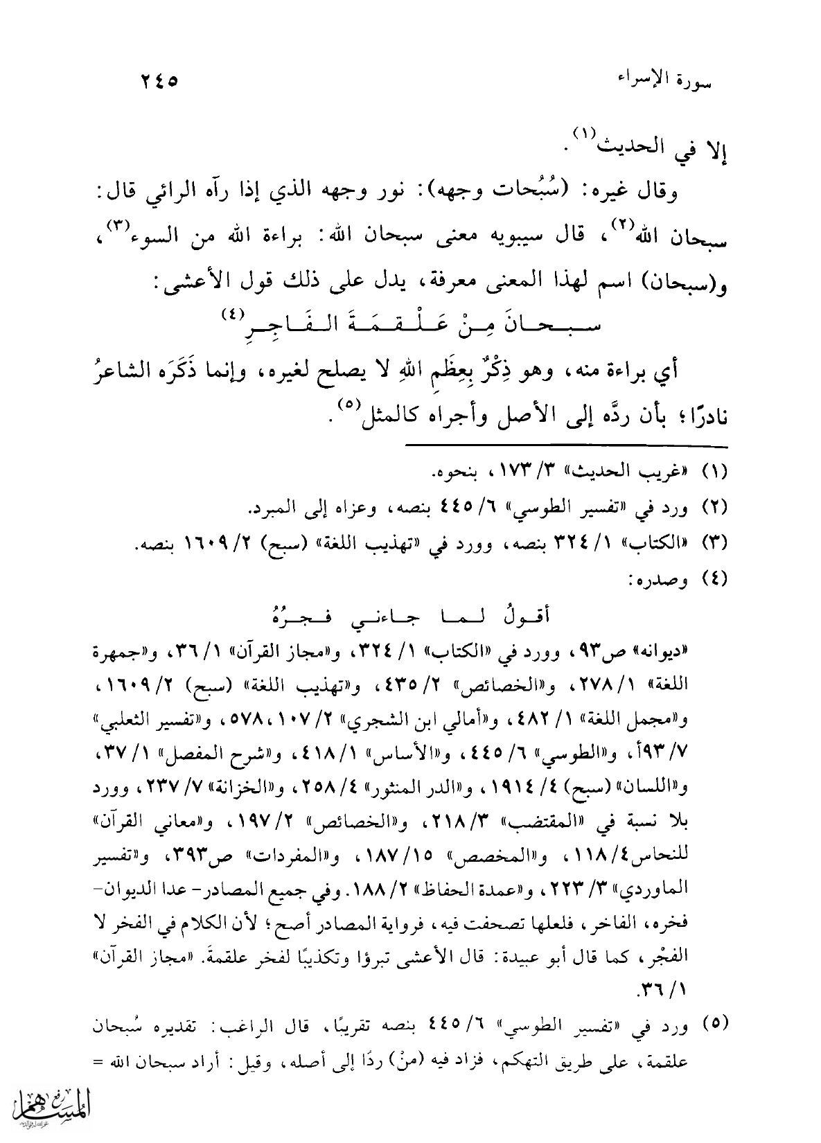 (¬5) ورد في "تفسير الطوسي" 6/ 445 بنصه تقريبًا، قال الراغب: تقديره سُبحان علقمة، على طريق التهكم، فزاد فيه (منْ) ردًا إلى أصله، وقيل: أراد سبحان الله =