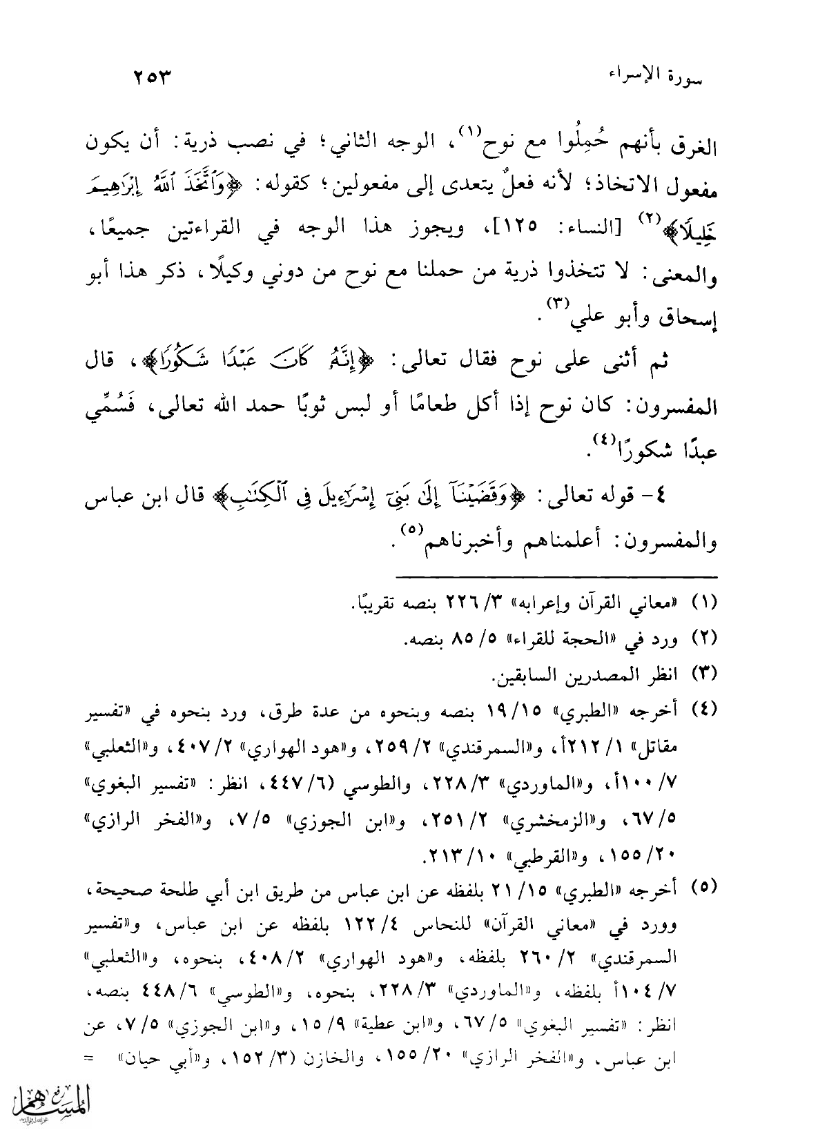 الغرق بأنهم حُمِلُوا مع نوح (¬1)، الوجه الثاني؛ في نصب ذرية: أن يكون مفعول الاتخاذ؛ لأنه فعلٌ يتعدى إلى مفعولين؛ كقوله: {وَاتَّخَذَ اللَّهُ إِبْرَاهِيمَ خَلِيلًا} (¬2) [النساء: 125]، ويجوز هذا الوجه في القراءتين جميعًا، والمعنى: لا تتخذوا ذرية من حملنا مع نوح من دوني وكيلاً، ذكر هذا أبو إسحاق وأبو علي (¬3).