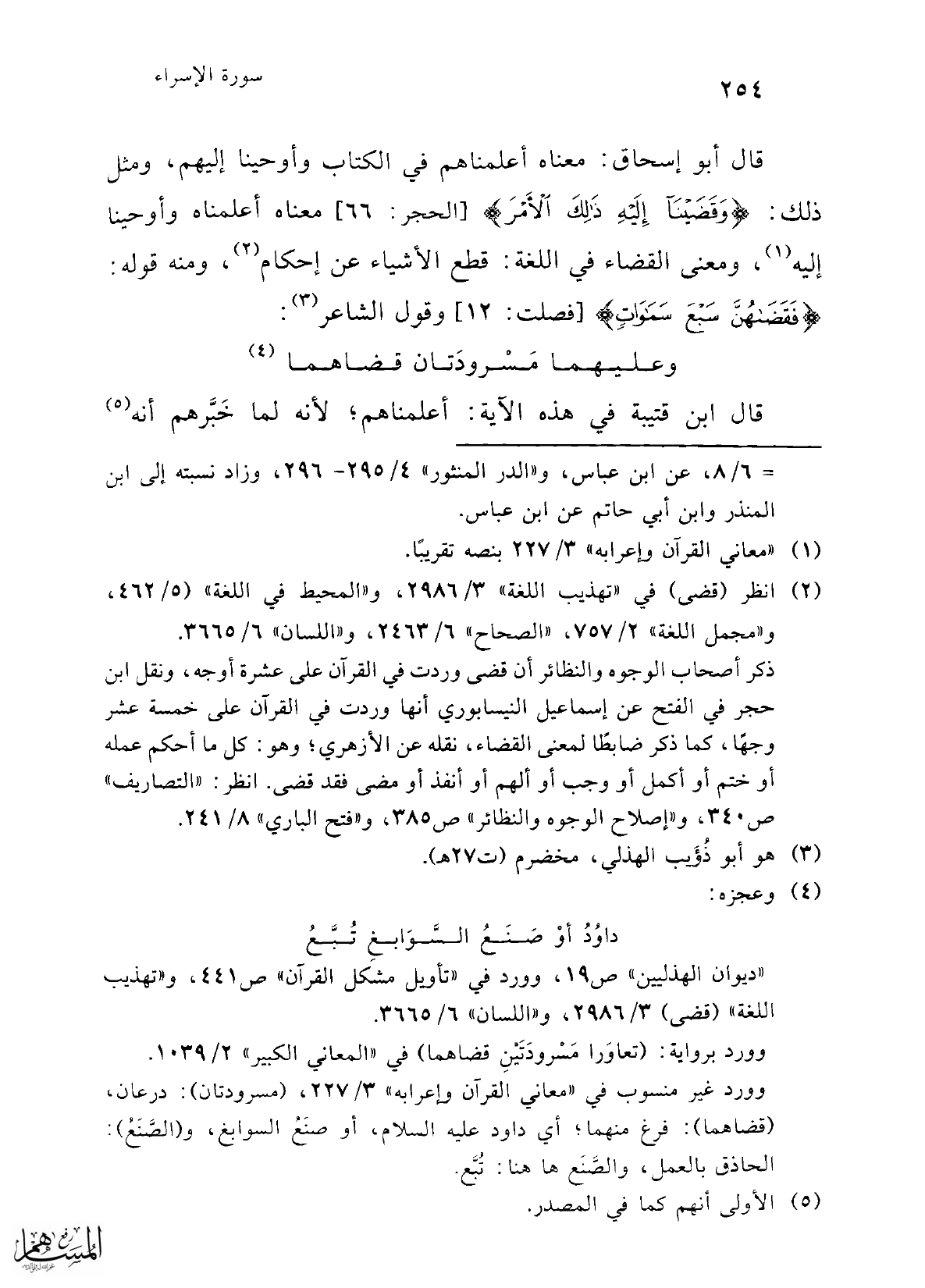قال أبو إسحاق: معناه أعلمناهم في الكتاب وأوحينا إليهم، ومثل ذلك: {وَقَضَيْنَا إِلَيْهِ ذَلِكَ الْأَمْرَ} [الحجر: 66] معناه أعلمناه وأوحينا إليه (¬1)، ومعنى القضاء في اللغة: قطع الأشياء عن إحكام (¬2)، ومنه قوله: {فَقَضَاهُنَّ سَبْعَ سَمَاوَاتٍ} [فصلت: 12] وقول الشاعر (¬3):