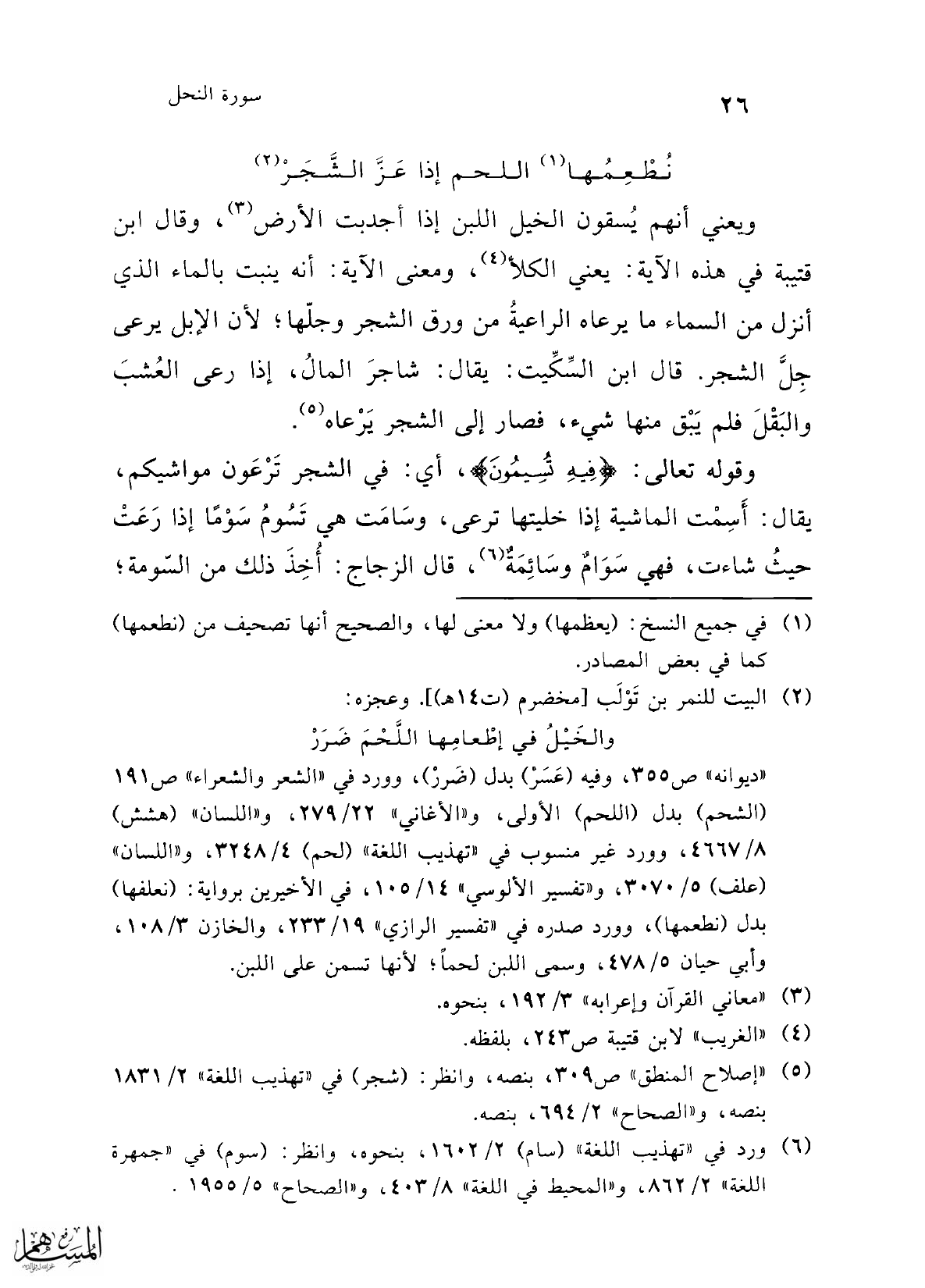 ويعني أنهم يُسقون الخيل اللبن إذا أجدبت الأرض (¬3)، وقال ابن قتيبه في هذه الآية: يعني الكلأ (¬4)، ومعنى الآية: أنه ينبت بالماء الذي أنزل من السماء ما يرعاه الراعيةُ من ورق الشجر وجلّها؛ لأن الإبل يرعى جِلَّ الشجر. قال ابن السِّكِّيت: يقال: شاجرَ المالُ، إذا رعى العُشبَ والبَقْلَ فلم يَبْق منها شيء، فصار إلى الشجر يَرْعاه (¬5).