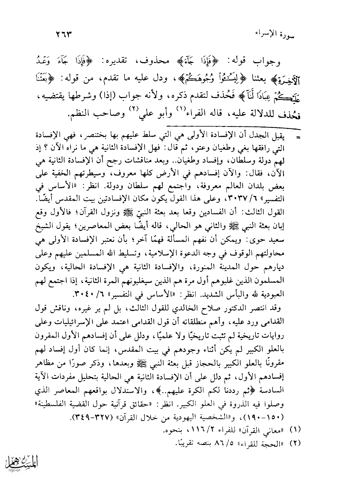 وقد انتصر الدكتور صلاح الخالدي للقول الثالث، بل لم ير غيره، وناقش قول القدامى ورد عليه، وأهم منطلقاته أن قول القدامى اعتمد على الإسرائيليات وعلى روايات تاريخية لم تثبت تاريخيًا ولا علميًا، ودلل على أن إفسادهم الأول المقرون بالعلو الكبير لم يكن أثناء وجودهم في بيت المقدس، إنما كان أول إفساد لهم مقرونًا بالعلو الكبير بالحجاز قبل بعثة النبي -صلى الله عليه وسلم- وبعدها، وذكر صورًا من مظاهر إفسادهم الأول، ثم دلل على أن الإفسادة الثانية هي الحالية بتحليل مفردات الآية السادسة {ثُمَّ رَدَدْنَا لَكُمُ الْكَرَّةَ عَلَيْهِمْ ..}، والاستدلال بواقعهم المعاصر الذي وصلوا فيه الذروة في العلو الكبير. انظر: "حقائق قرآنية حول القضية الفلسطينية" (150 - 190)، و"الشخصية اليهودية من خلال القرآن" (327 - 349).