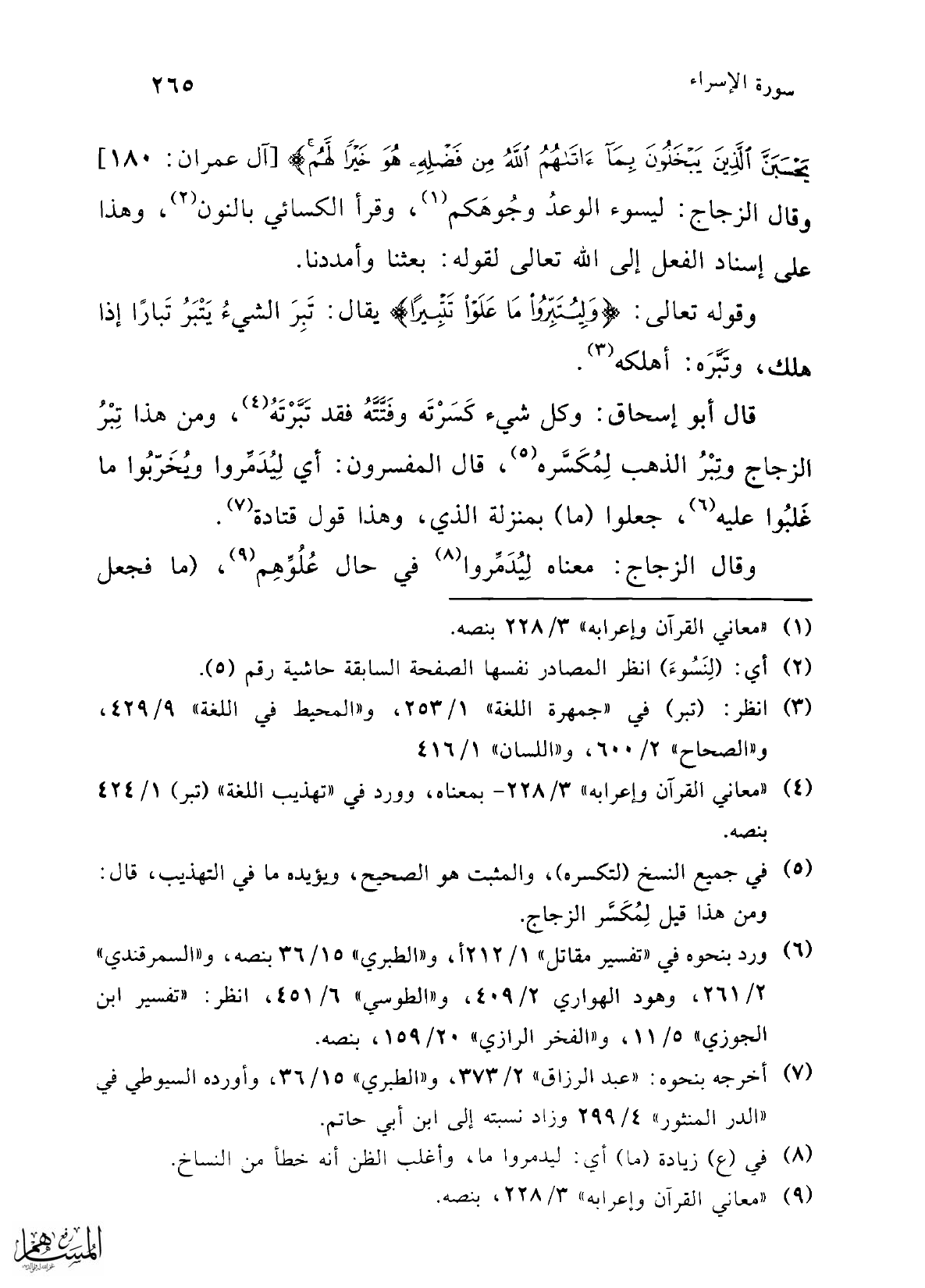 (¬4) "معاني القرآن وإعرابه" 3/ 228 - بمعناه، وورد في "تهذيب اللغة" (تبر) 1/ 424 بنصه.