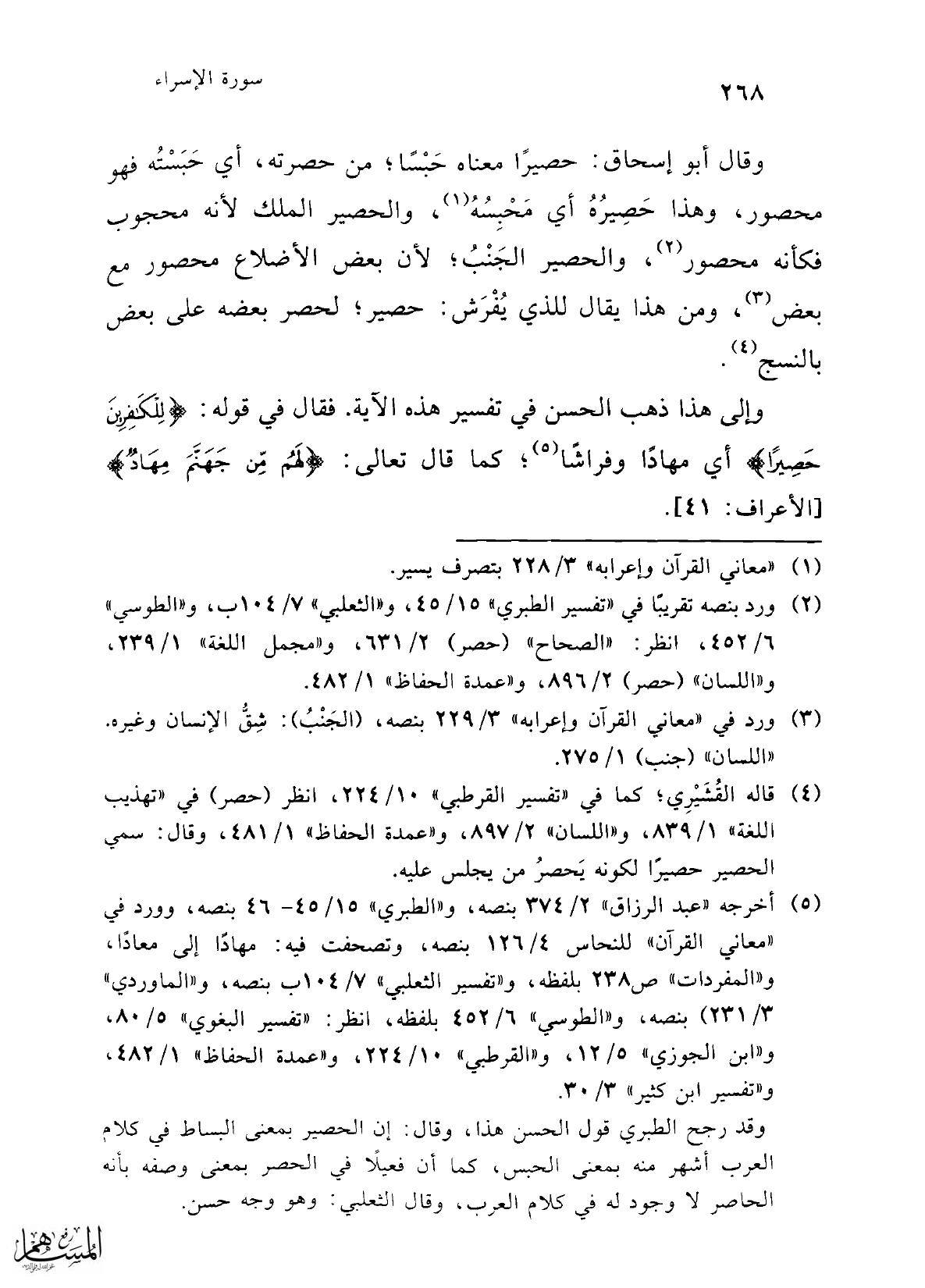 (¬2) ورد بنصه تقريبًا في "تفسير الطبري" 15/ 45، و"الثعلبي" 7/ 104 ب، و"الطوسي" 6/ 452، انظر: "الصحاح" (حصر) 2/ 631، و"مجمل اللغة" 1/ 239، و"اللسان" (حصر) 2/ 896، و"عمدة الحفاظ" 1/ 482.