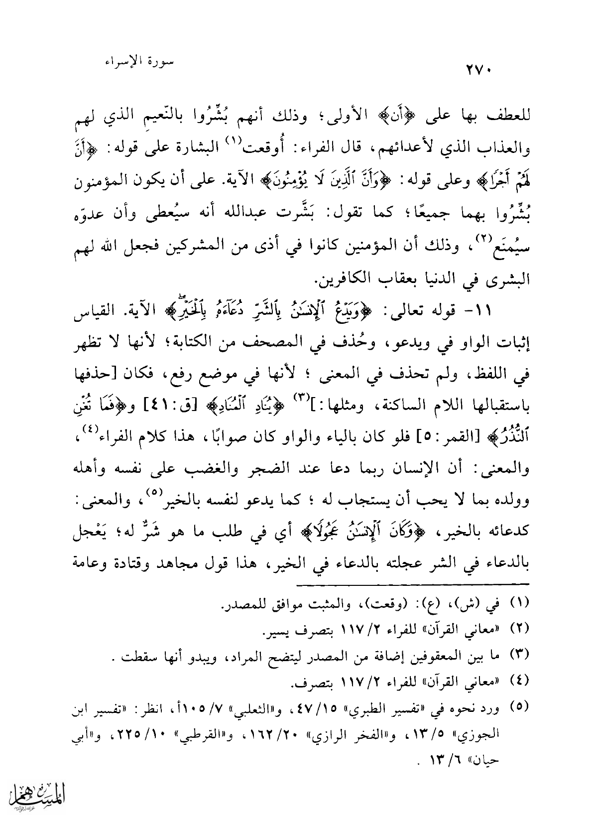 11 - قوله تعالى: {وَيَدْعُ الْإِنْسَانُ بِالشَّرِّ دُعَاءَهُ بِالْخَيْرِ} الآية. القياس إثبات الواو في ويدعو، وحُذف في المصحف من الكتابة؛ لأنها لا تظهر في اللفظ، ولم تحذف في المعنى؛ لأنها في موضع رفع، فكان [حذفها باستقبالها اللام الساكنة، ومثلها:] (¬3) {يُنَادِ الْمُنَادِ} [ق: 41] و {فَمَا تُغْنِ النُّذُرُ} [القمر: 5] فلو كان بالياء والواو كان صوابًا، هذا كلام الفراء (¬4)، والمعنى: أن الإنسان ربما دعا عند الضجر والغضب على نفسه وأهله وولده بما لا يحب أن يستجاب له؛ كما يدعو لنفسه بالخير (¬5)، والمعنى: كدعائه بالخير، {وَكَانَ الْإِنْسَانُ عَجُولًا} أي في طلب ما هو شَرٌّ له، يَعْجل بالدعاء في الشر عجلته بالدعاء في الخير، هذا قول مجاهد وقتادة وعامة