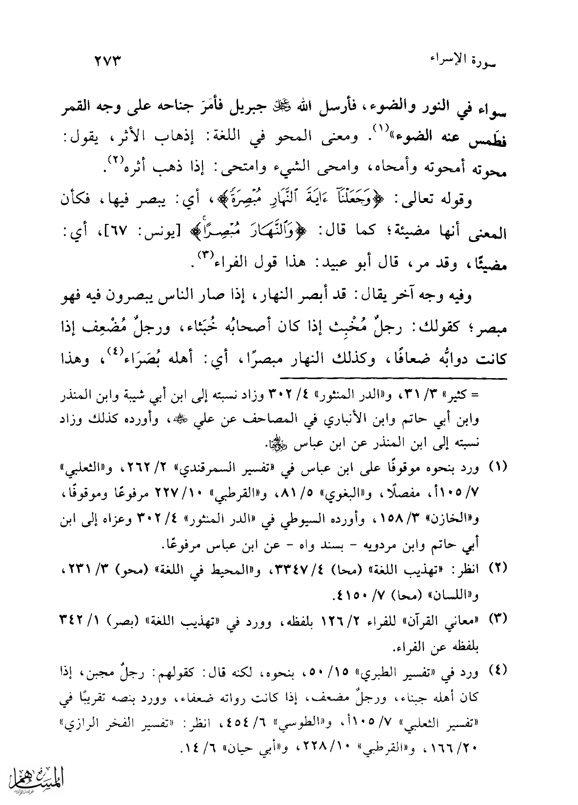 سواء في النور والضوء، فأرسل الله -عز وجل- جبريل فأمَرّ جناحه على وجه القمر فطَمس عنه الضوء" (¬1). ومعنى المحو في اللغة: إذهاب الأثر، يقول: محوته أمحوته وأمحاه، وامحى الشيء وامتحى: إذا ذهب أثره (¬2).
