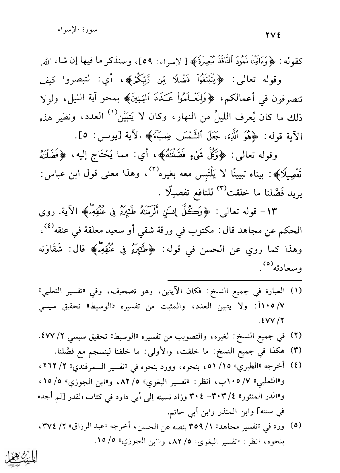 13 - قوله تعالى: {وَكُلَّ إِنْسَانٍ أَلْزَمْنَاهُ طَائِرَهُ فِي عُنُقِهِ} الآية. روى الحكم عن مجاهد قال: مكتوب في ورقة شقي أو سعيد معلقة في عنقه (¬4)، وهذا كما روي عن الحسن في قوله: {طَائِرَهُ فِي عُنُقِهِ} قال: شَقَاوَته وسعادته (¬5).