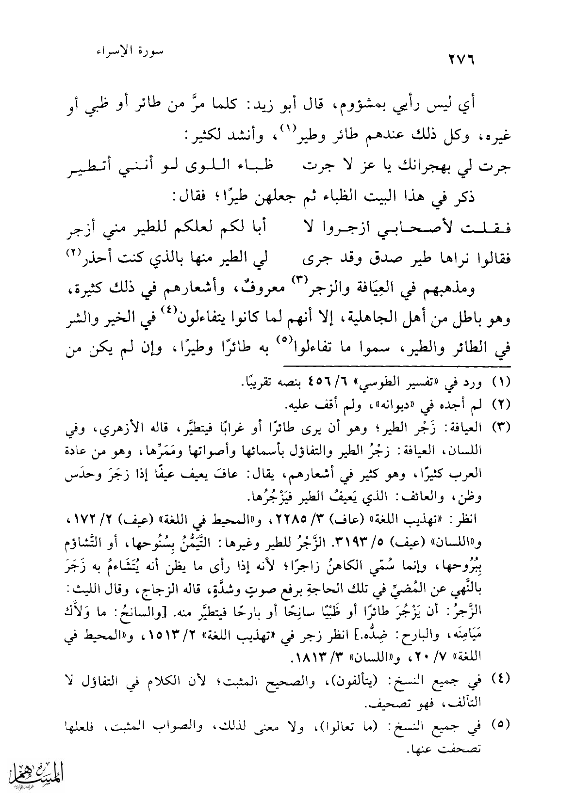 ومذهبهم في العِيَافة والزجر (¬3) معروفٌ، وأشعارهم في ذلك كثيرة، وهو باطل من أهل الجاهلية، إلا أنهم لما كانوا يتفاءلون (¬4) في الخير والشر في الطائر والطير، سموا ما تفاءلوا (¬5) به طائرًا وطيرًا، وإن لم يكن من