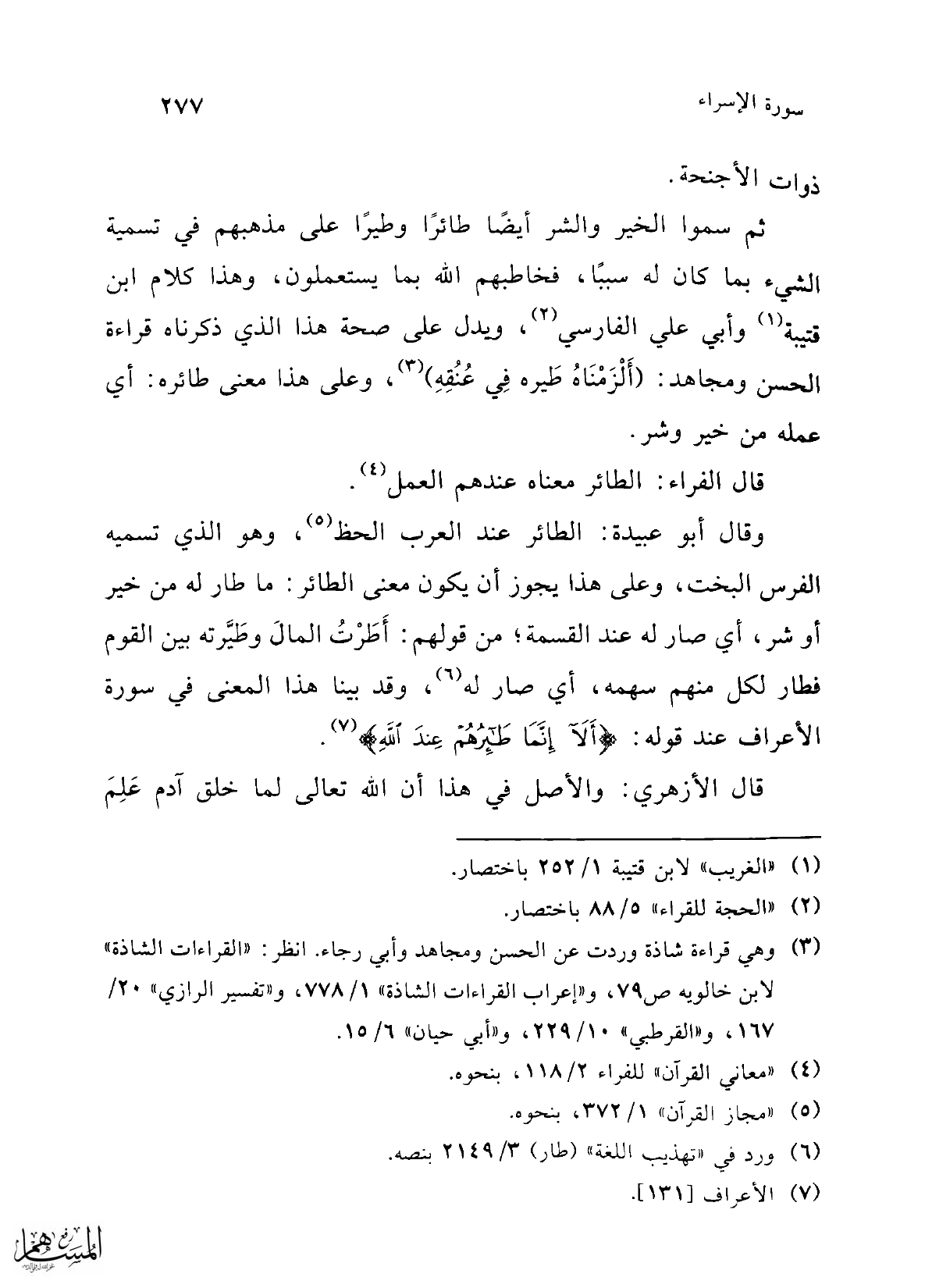 ثم سموا الخير والشر أيضًا طائرًا وطيرًا على مذهبهم في تسمية الشيء بما كان له سببًا، فخاطبهم الله بما يستعملون، وهذا كلام ابن قتيبة (¬1) وأبي علي الفارسي (¬2)، ويدل على صحة هذا الذي ذكرناه قراءة الحسن ومجاهد: (أَلْزَمْنَاهُ طَيره فِي عُنُقِهِ) (¬3)، وعلى هذا معنى طائره: أي عمله من خير وشر.