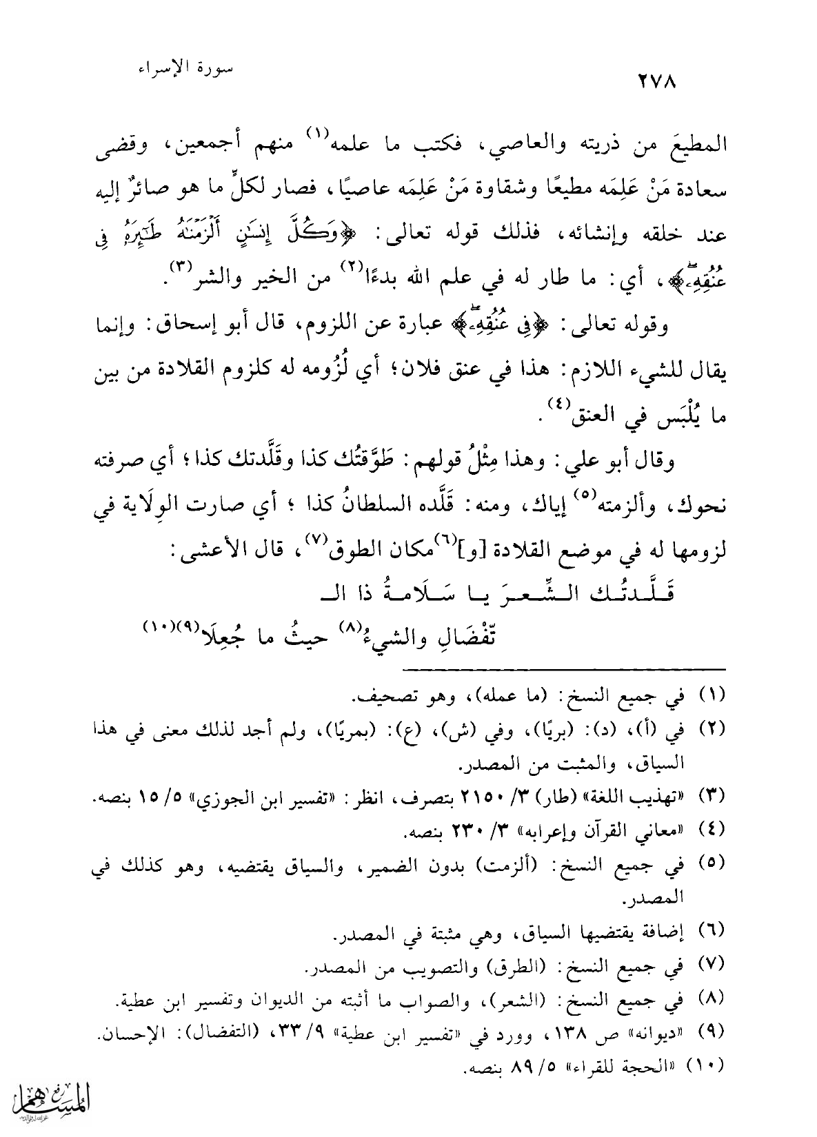 وقوله تعالى: {فِي عُنُقِهِ} عبارة عن اللزوم، قال أبو إسحاق: وإنما يقال للشيء اللازم: هذا في عنق فلان؛ أي لُزُومه له كلزوم القلادة من بين ما يُلْبَس في العنق (¬4).