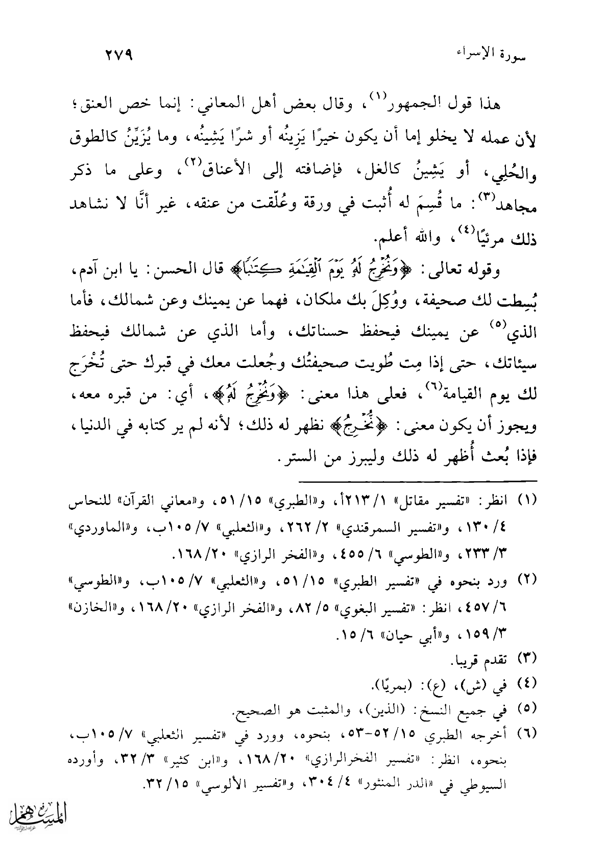 هذا قول الجمهور (¬1)، وقال بعض أهل المعاني: إنما خص العنق؛ لأن عمله لا يخلو إما أن يكون خيرًا يَزِينُه أو شرًا يَشِينُه، وما يُزَيِّنُ كالطوق والحُلِي، أو يَشِينُ كالغل، فإضافته إلى الأعناق (¬2)، وعلى ما ذكر مجاهد (¬3): ما قُسِمَ له أُثبت في ورقة وعُلّقت من عنقه، غير أنَّا لا نشاهد ذلك مرئيًا (¬4)، والله أعلم.