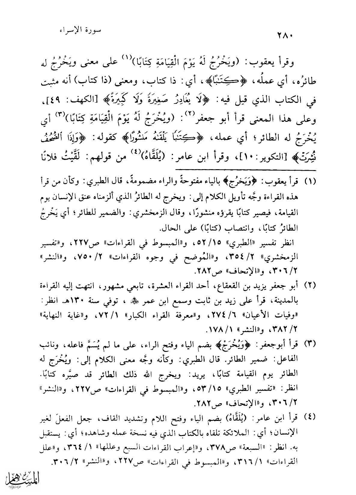 (¬1) قرأ يعقوب: {وَيَخرُج} بالياء مفتوحةً والراء مضمومةً، قال الطبري: وكأن من قرأ هذه القراءة وجَّه تأويل الكلام إلى: ويخرج له الطائرُ الذي ألزمناه عنق الإنسان يوم القيامة، فيصير كتابًا يقرؤه منشورًا، وقال الزمخشري: والضمير للطائر؛ أي يَخْرجُ الطائرُ كتابًا، وانتصاب (كتابًا) على الحال.