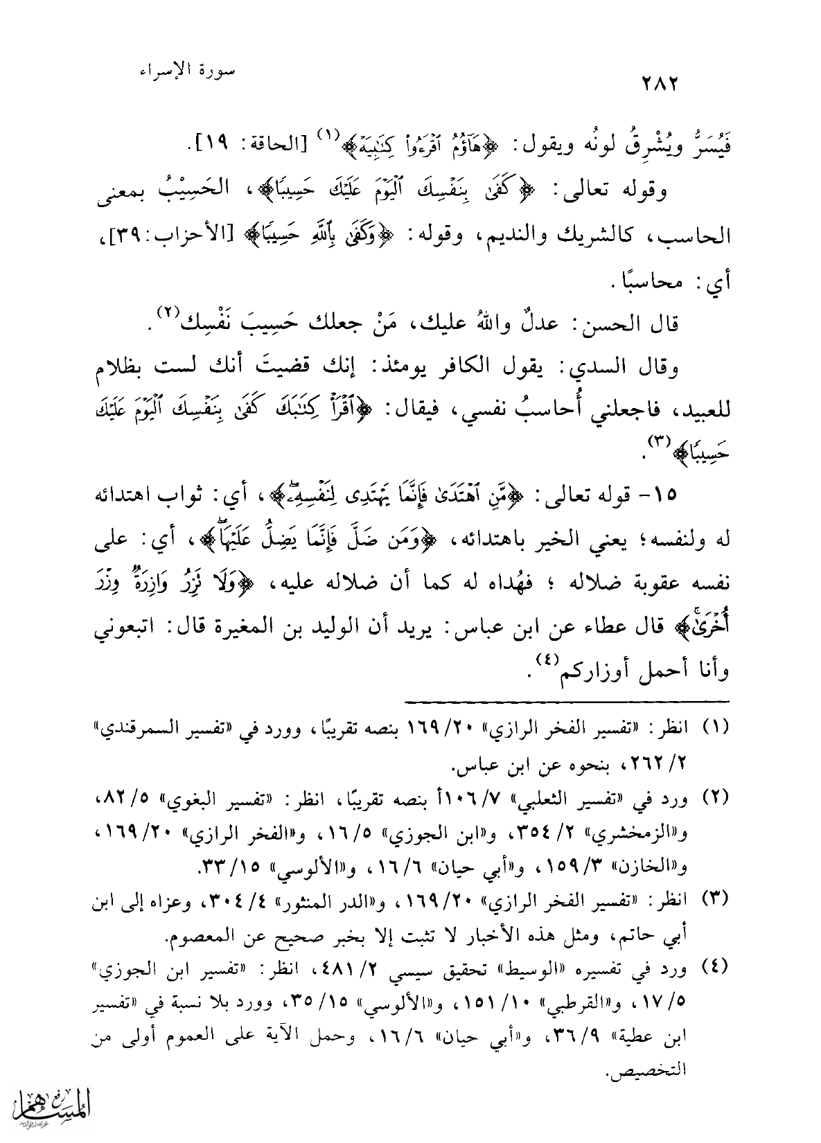 (¬4) ورد في تفسيره "الوسيط" تحقيق سيسي 2/ 481، انظر: "تفسير ابن الجوزي" 5/ 17، و"القرطبي" 10/ 151، و"الألوسي" 15/ 35، وورد بلا نسبة في "تفسير ابن عطية" 9/ 36، و"أبي حيان" 6/ 16، وحمل الآية على العموم أولى من التخصيص.