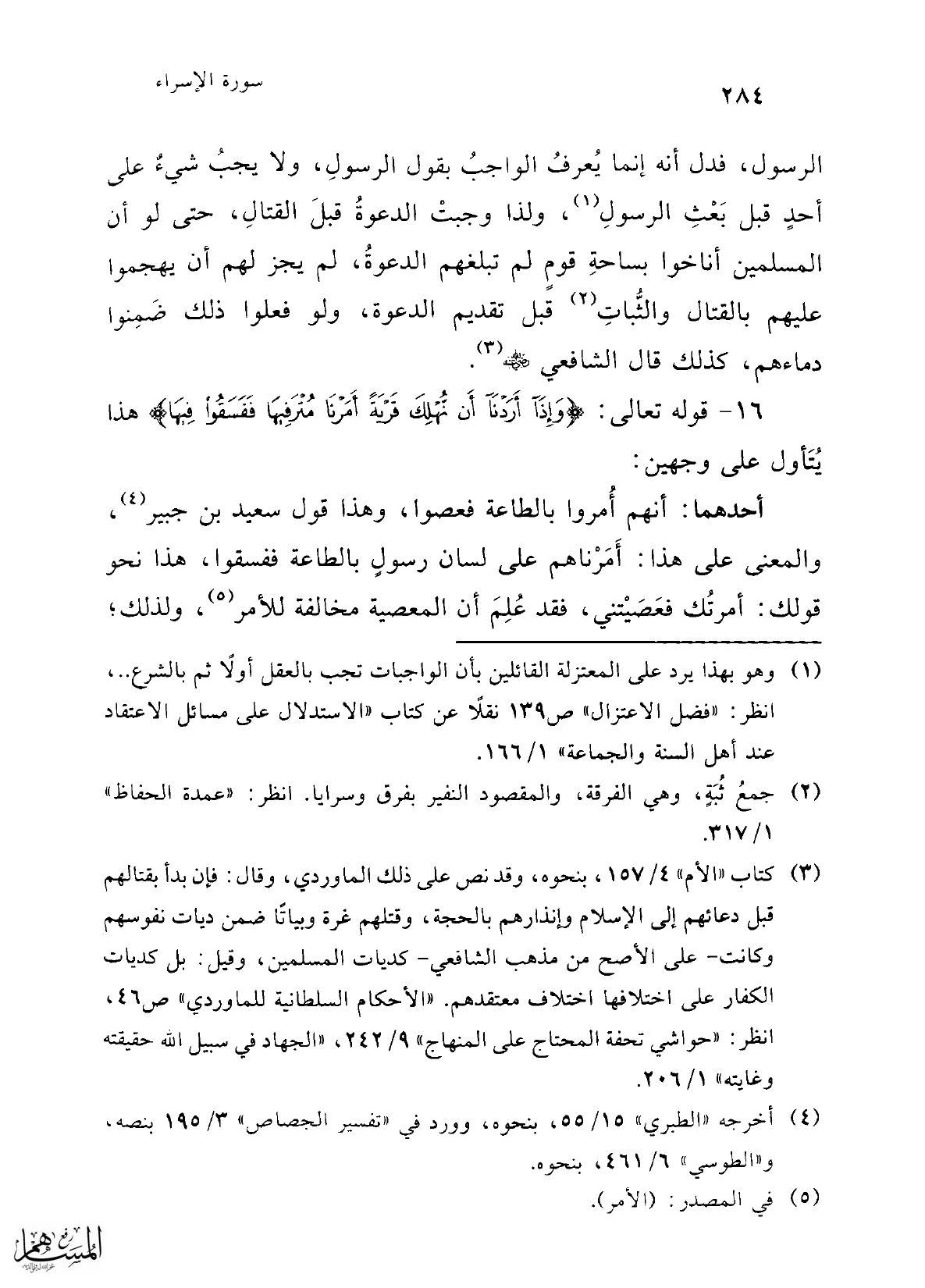 (¬1) وهو بهذا يرد على المعتزلة القائلين بأن الواجبات تجب بالعقل أولاً ثم بالشرع .. ، انظر: "فضل الاعتزال" ص 139 نقلاً عن كتاب "الاستدلال على مسائل الاعتقاد عند أهل السنة والجماعة" 1/ 166.
